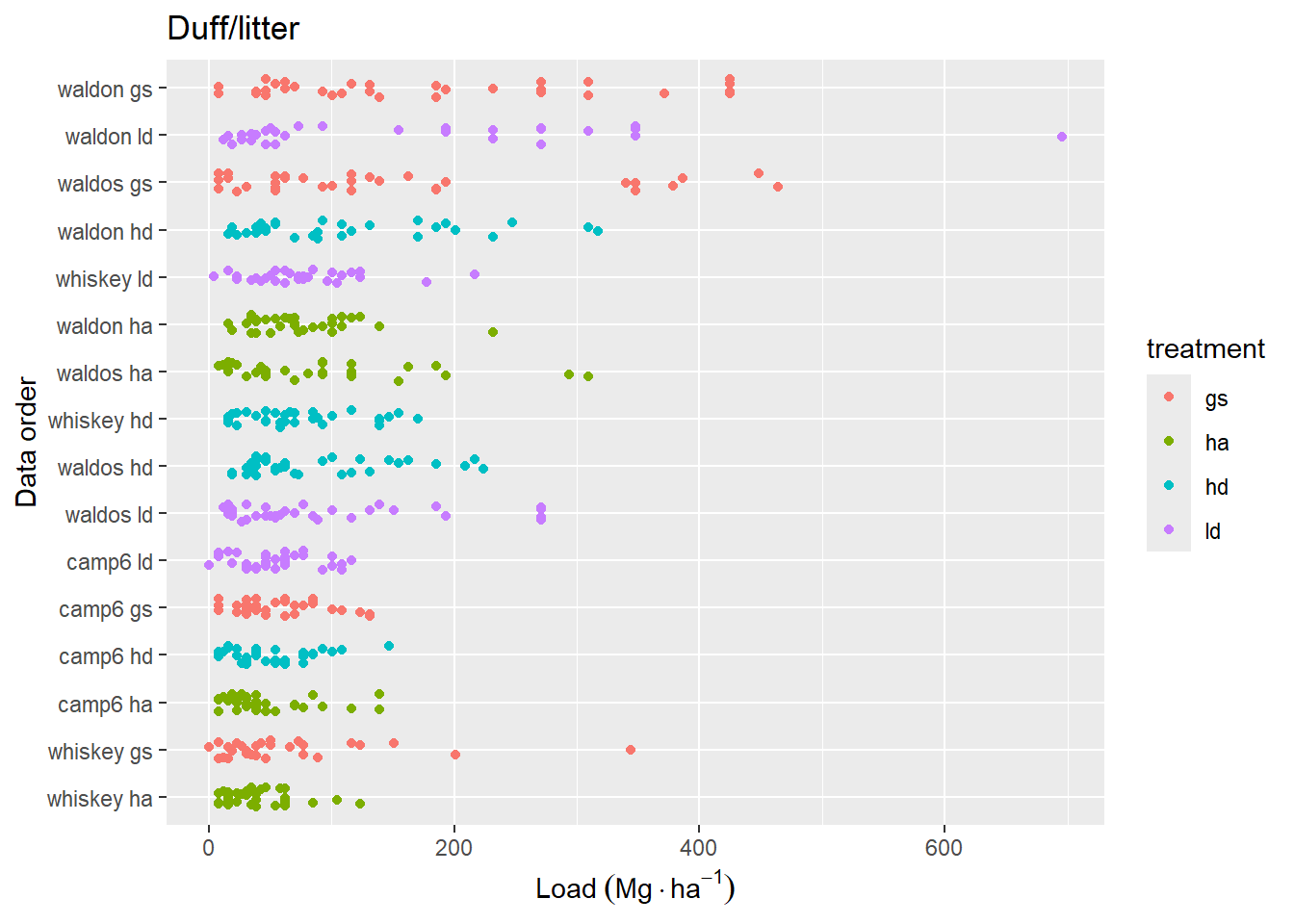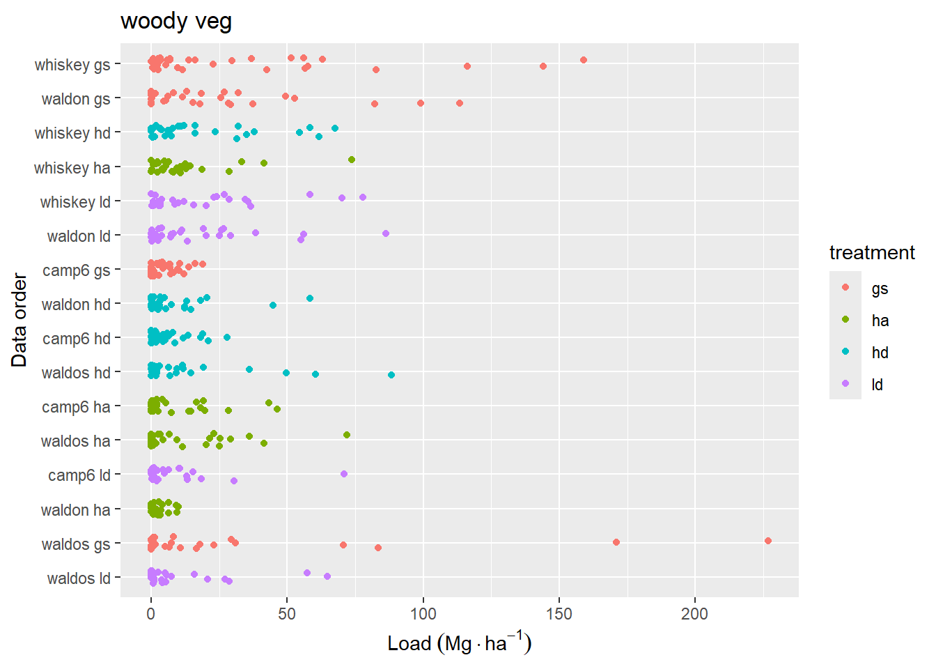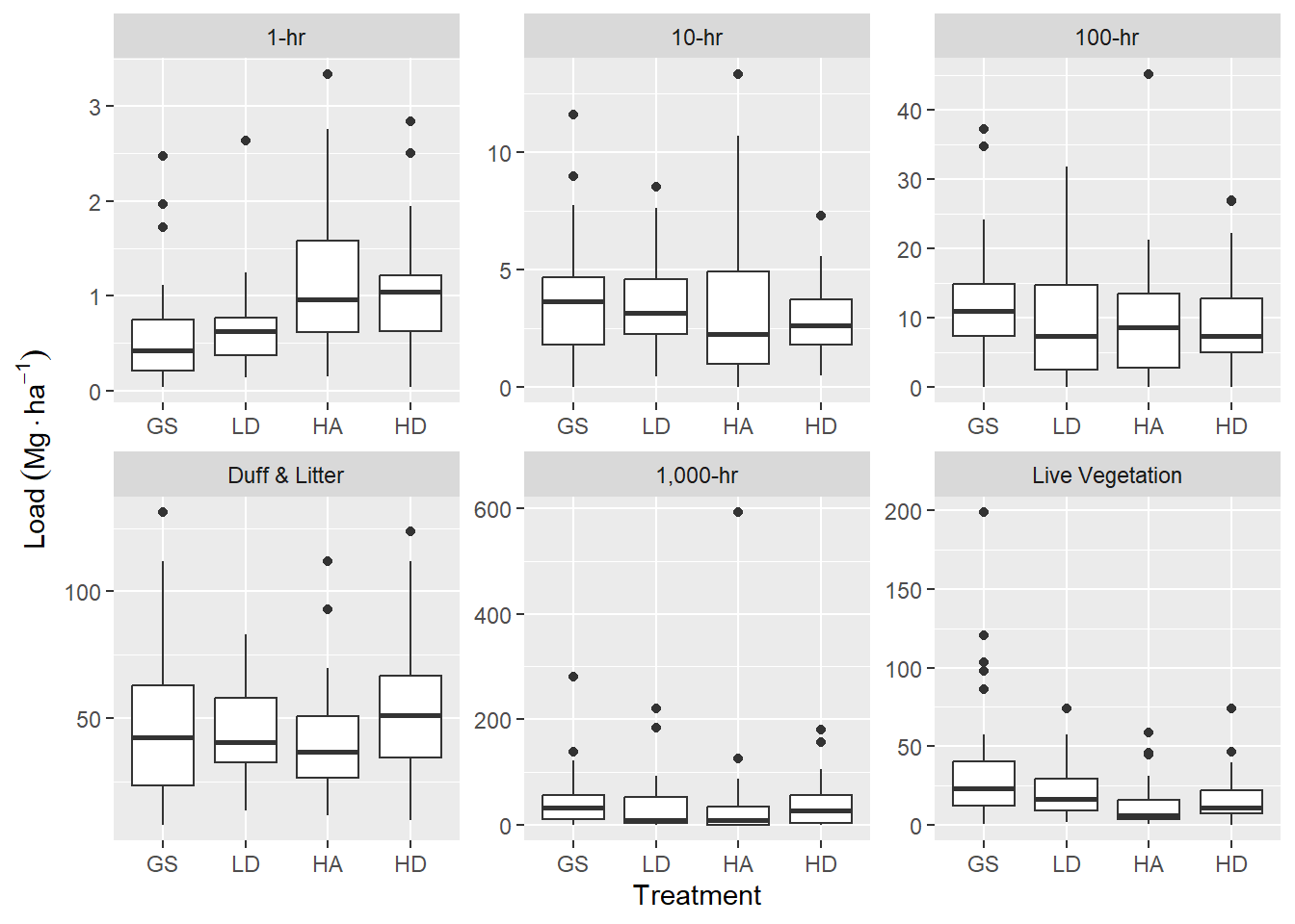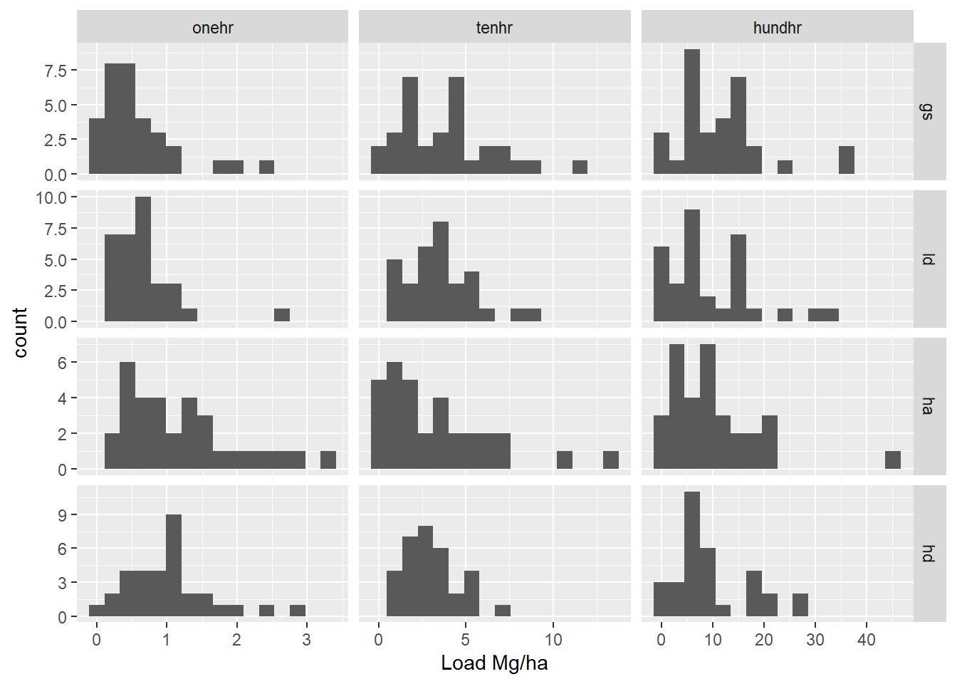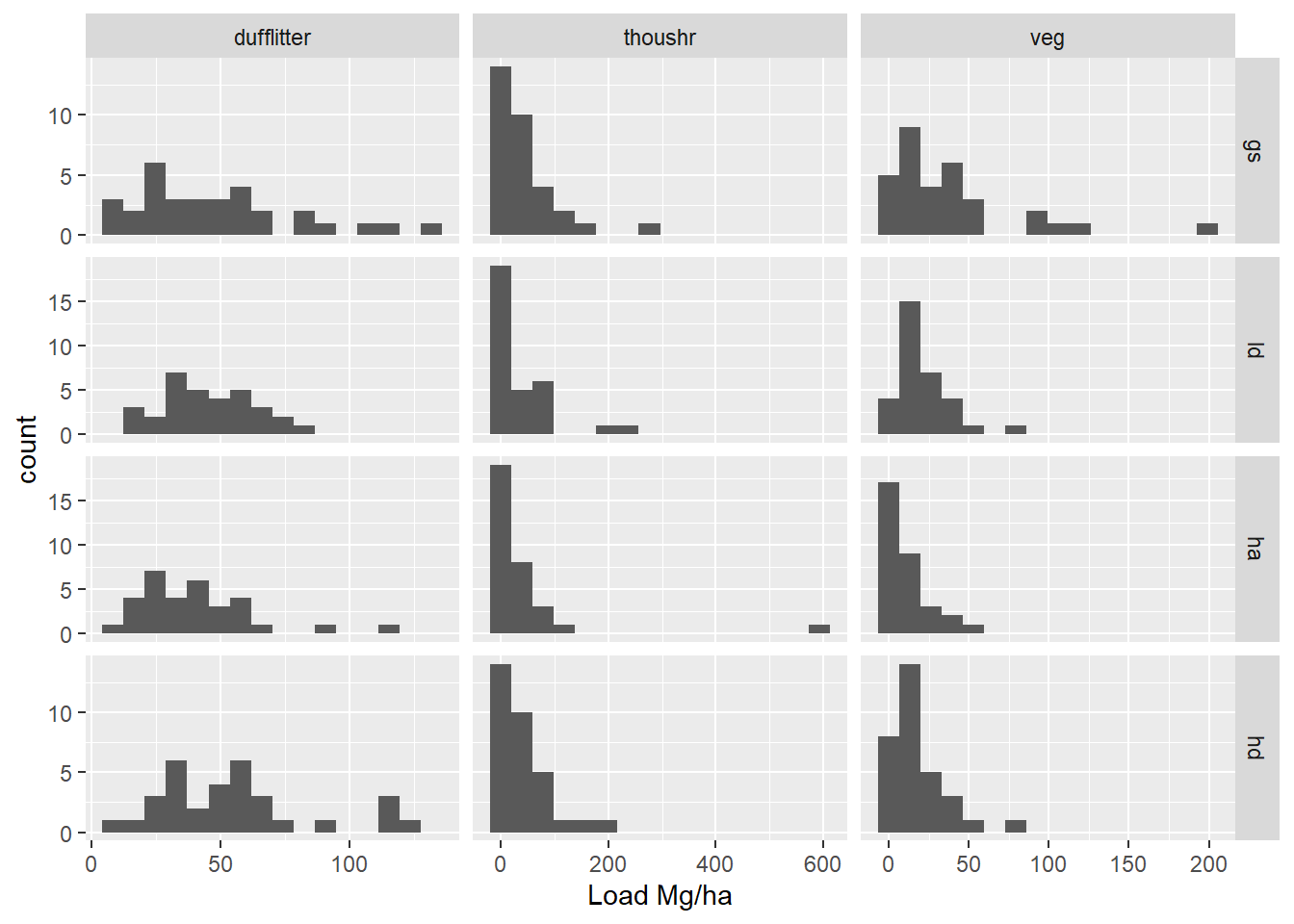 # This code creates a dataframe with nested columns that include the original# data and calculated coordinates of a superimposed normal distribution.# TODO: why does this inlcude site corner azi?bins <-16hist_dat <-load2("long", "pre", all_of(treatment_load_vars)) |>drop_na() |># Facet grid each column (class) has same scale, find limits to calculate bin# width, limits are either implied by the constructed normal curce, or the raw# datagroup_by(class) |>mutate(xmin =min(c(mean(load) -3*sd(load), load)),xmax =max(c(mean(load) +3*sd(load), load)) ) |>group_by(treatment, class) |>nest(data = load) |># generate data for a normal curve with mean and sd from observed data to# cover 3 sd.mutate(norm_x =map(data, function(d) {seq(from =mean(d$load) -3*sd(d$load),to =mean(d$load) +3*sd(d$load),length.out =100 ) }),# scale curve to expected binwidth based on plot layout (same x scale across# all fuel classes) multiplied by the number of observations. The histogram# and normal curve should represent the same total area.norm_y =map(data, function(d) { dens <-dnorm(unlist(norm_x), mean =mean(d$load), sd =sd(d$load)) dens * ((xmax - xmin) / bins) *nrow(d) }) )# here is the code to plot the above data. I decided not to use this after all,# but it was a lot of work, so I'm keeping it for posterity# nolint start# ggplot(filter(hist_dat, class %in% load_vars[1:3] )) +# geom_histogram(data = \(x) unnest(x, data), aes(x = load), bins = bins) +# geom_line(data = \(x) unnest(x, c(norm_x, norm_y)), aes(norm_x, norm_y)) +# facet_grid(treatment ~ class, scales = "free") +# labs(y = "count", x = "Load Mg/ha")## ggplot(filter(hist_dat, class %in% load_vars[4:6] )) +# geom_histogram(data = \(x) unnest(x, data), aes(x = load), bins = bins) +# geom_line(data = \(x) unnest(x, c(norm_x, norm_y)), aes(norm_x, norm_y)) +# facet_grid(treatment ~ class, scales = "free") +# labs(y = "count", x = "Load Mg/ha")# nolint end