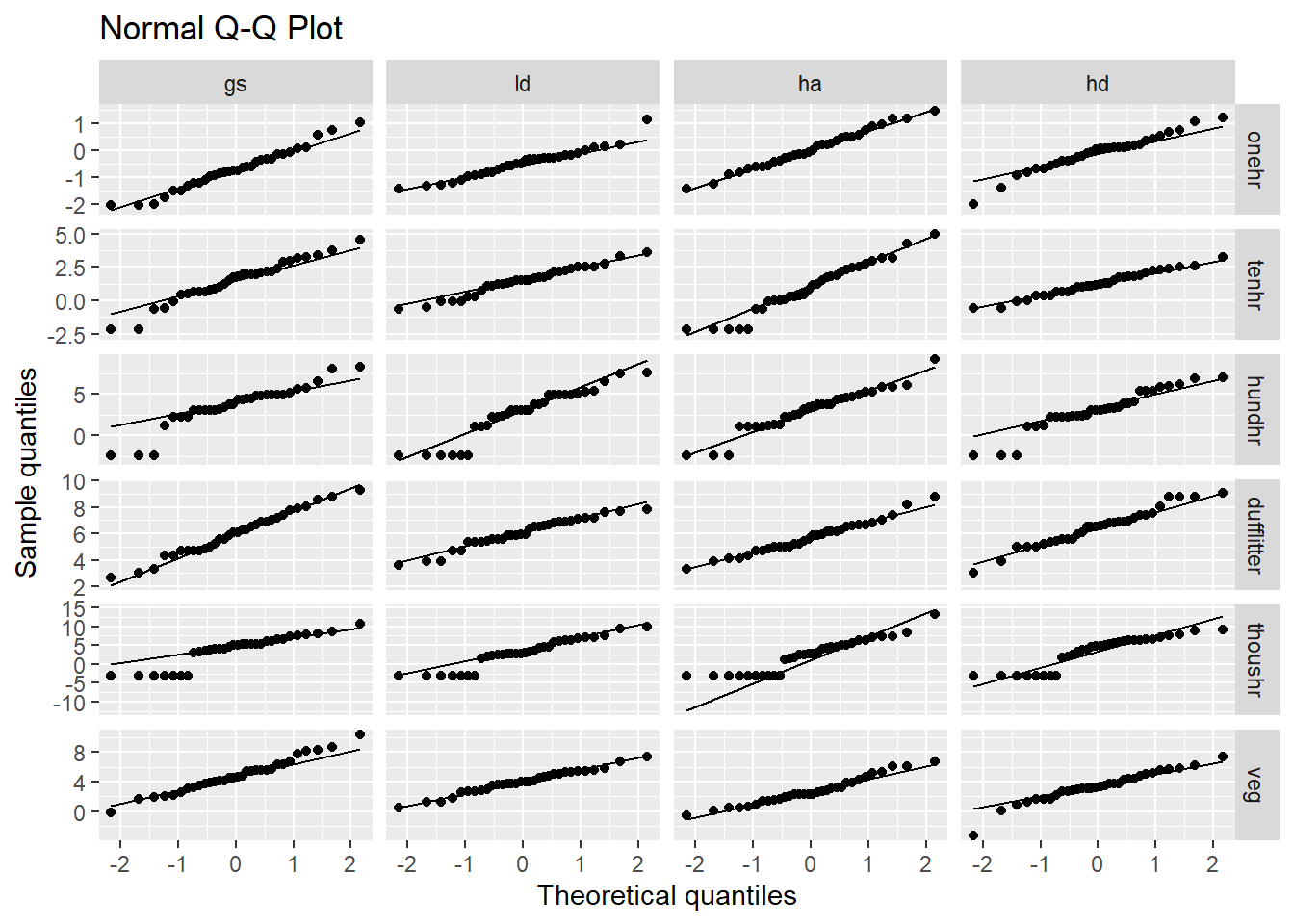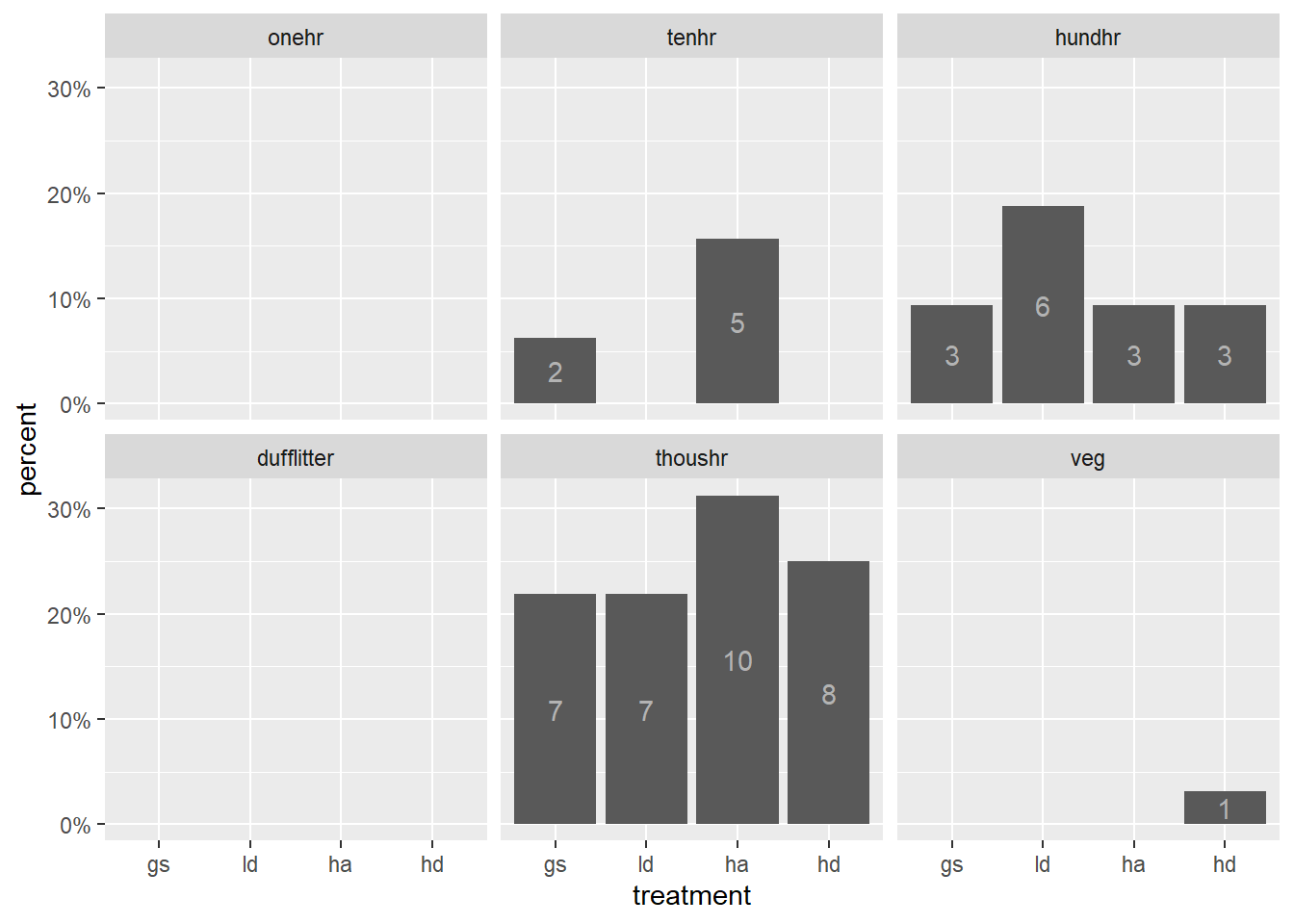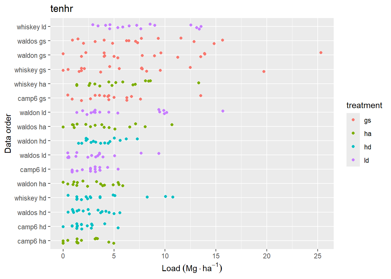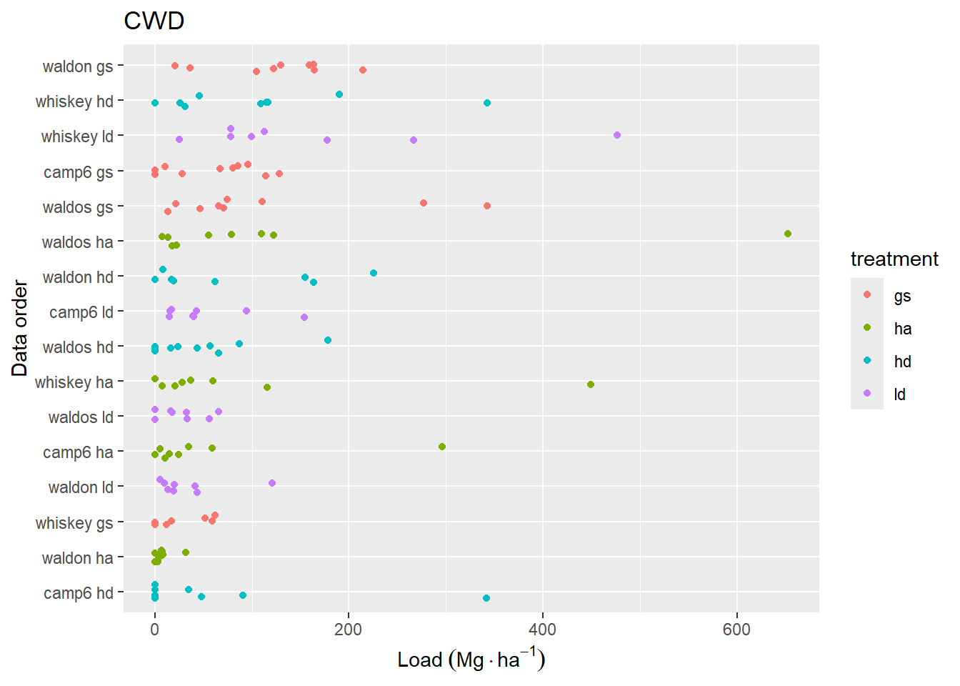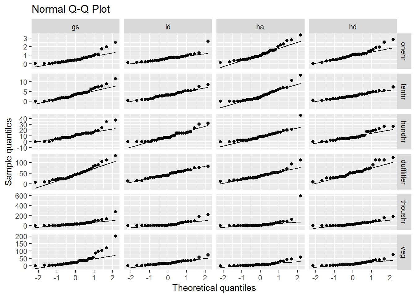 # This code creates a dataframe with nested columns that include the original# data and calculated coordinates of a superimposed normal distribution.# TODO: why does this inlcude site corner azi?bins <-16hist_dat <-load2("long", "pre", all_of(treatment_load_vars)) |>drop_na() |># Facet grid each column (class) has same scale, find limits to calculate bin# width, limits are either implied by the constructed normal curce, or the raw# datagroup_by(class) |>mutate(xmin =min(c(mean(load) -3*sd(load), load)),xmax =max(c(mean(load) +3*sd(load), load)) ) |>group_by(treatment, class) |>nest(data = load) |># generate data for a normal curve with mean and sd from observed data to# cover 3 sd.mutate(norm_x =map(data, function(d) {seq(from =mean(d$load) -3*sd(d$load),to =mean(d$load) +3*sd(d$load),length.out =100 ) }),# scale curve to expected binwidth based on plot layout (same x scale across# all fuel classes) multiplied by the number of observations. The histogram# and normal curve should represent the same total area.norm_y =map(data, function(d) { dens <-dnorm(unlist(norm_x), mean =mean(d$load), sd =sd(d$load)) dens * ((xmax - xmin) / bins) *nrow(d) }) )# here is the code to plot the above data. I decided not to use this after all,# but it was a lot of work, so I'm keeping it for posterity# nolint start# ggplot(filter(hist_dat, class %in% load_vars[1:3] )) +# geom_histogram(data = \(x) unnest(x, data), aes(x = load), bins = bins) +# geom_line(data = \(x) unnest(x, c(norm_x, norm_y)), aes(norm_x, norm_y)) +# facet_grid(treatment ~ class, scales = "free") +# labs(y = "count", x = "Load Mg/ha")## ggplot(filter(hist_dat, class %in% load_vars[4:6] )) +# geom_histogram(data = \(x) unnest(x, data), aes(x = load), bins = bins) +# geom_line(data = \(x) unnest(x, c(norm_x, norm_y)), aes(norm_x, norm_y)) +# facet_grid(treatment ~ class, scales = "free") +# labs(y = "count", x = "Load Mg/ha")# nolint end