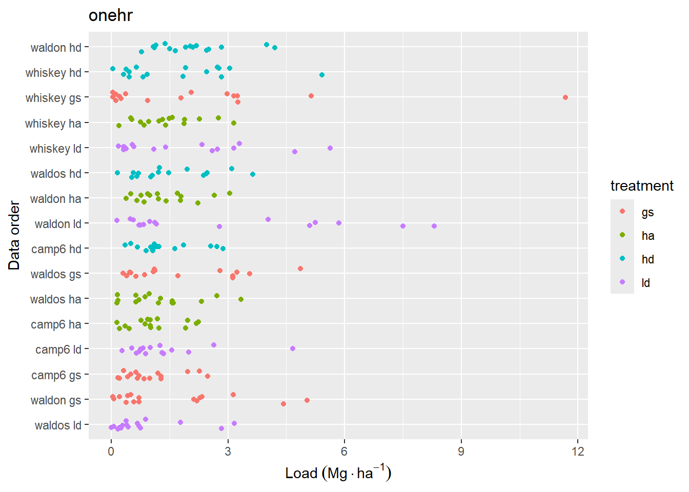 Figure 4.3: Data distribution of loading for fine woody debris classes. Data are sorted by mean loading within each replicate. Jitter has been added to aid in visual interpretation.