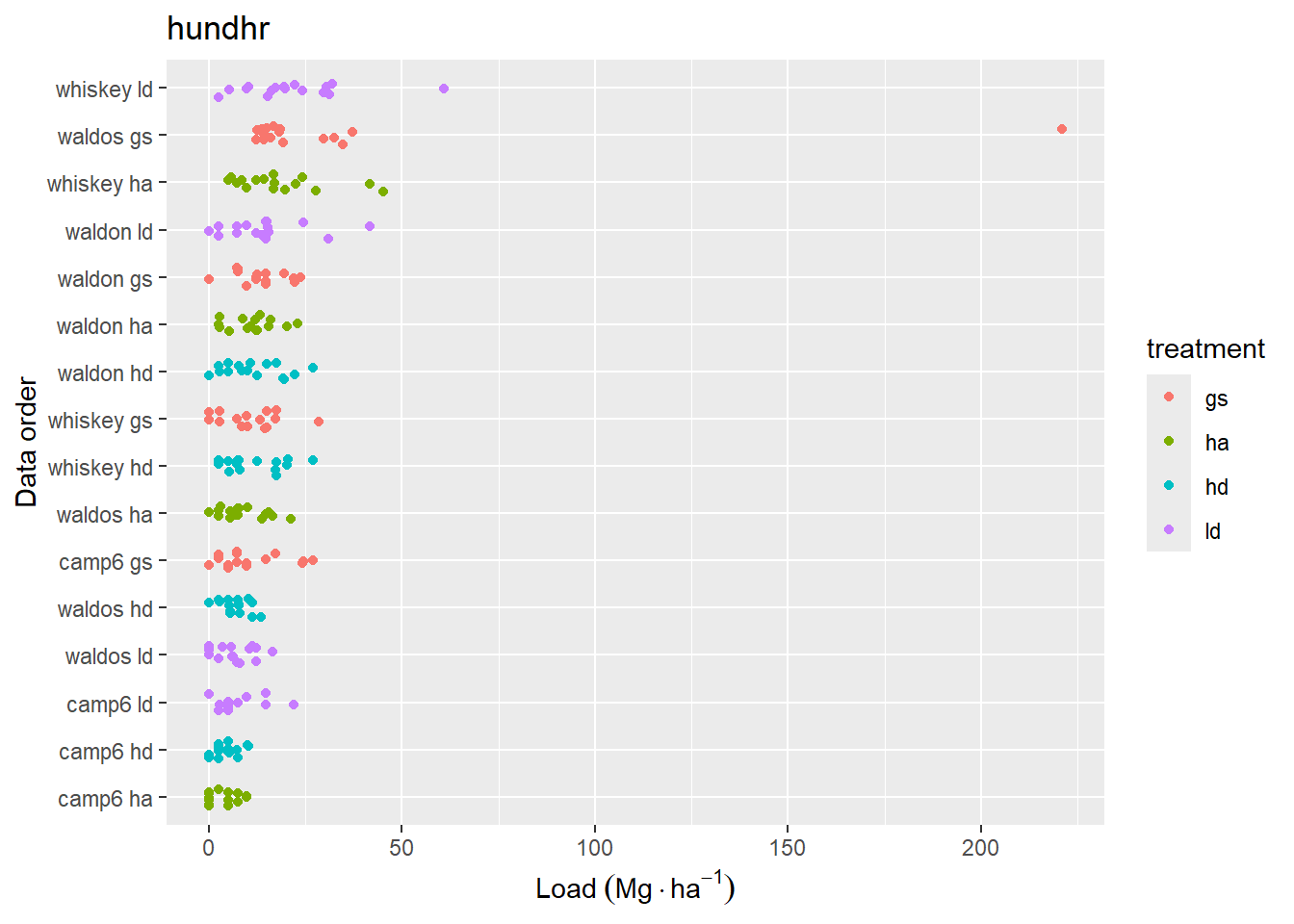 # function to access mostly raw data, but with combined veg and thoushr fuels.# and select the output variables (`...`)load2 <-function(shape ="wide", pct =c("pre", "post", "both"), ...) { pct <- pct[1] pct_filter <-switch(pct,pre ="prepct", post ="postpct", both ="prepct|postpct" ) tl <-filter(total_load, phase == pct_filter) load_vars <-c("onehr", "tenhr", "hundhr", "dufflitter", "thoushr", "veg", "veg_diff")# TODO: if(pct == "post")if (!missing(...)) tl <-select(tl, ...)if (shape =="long") { tl <-pivot_longer(tl,-any_of(c("phase", "site", "treatment", "corner", "azi")),names_to ="class",values_to ="load" ) load_vars <- load_vars[load_vars %in% tl$class] tl <-mutate(tl, class =factor(class, levels = load_vars)) |>filter(!is.na(load)) } tl}