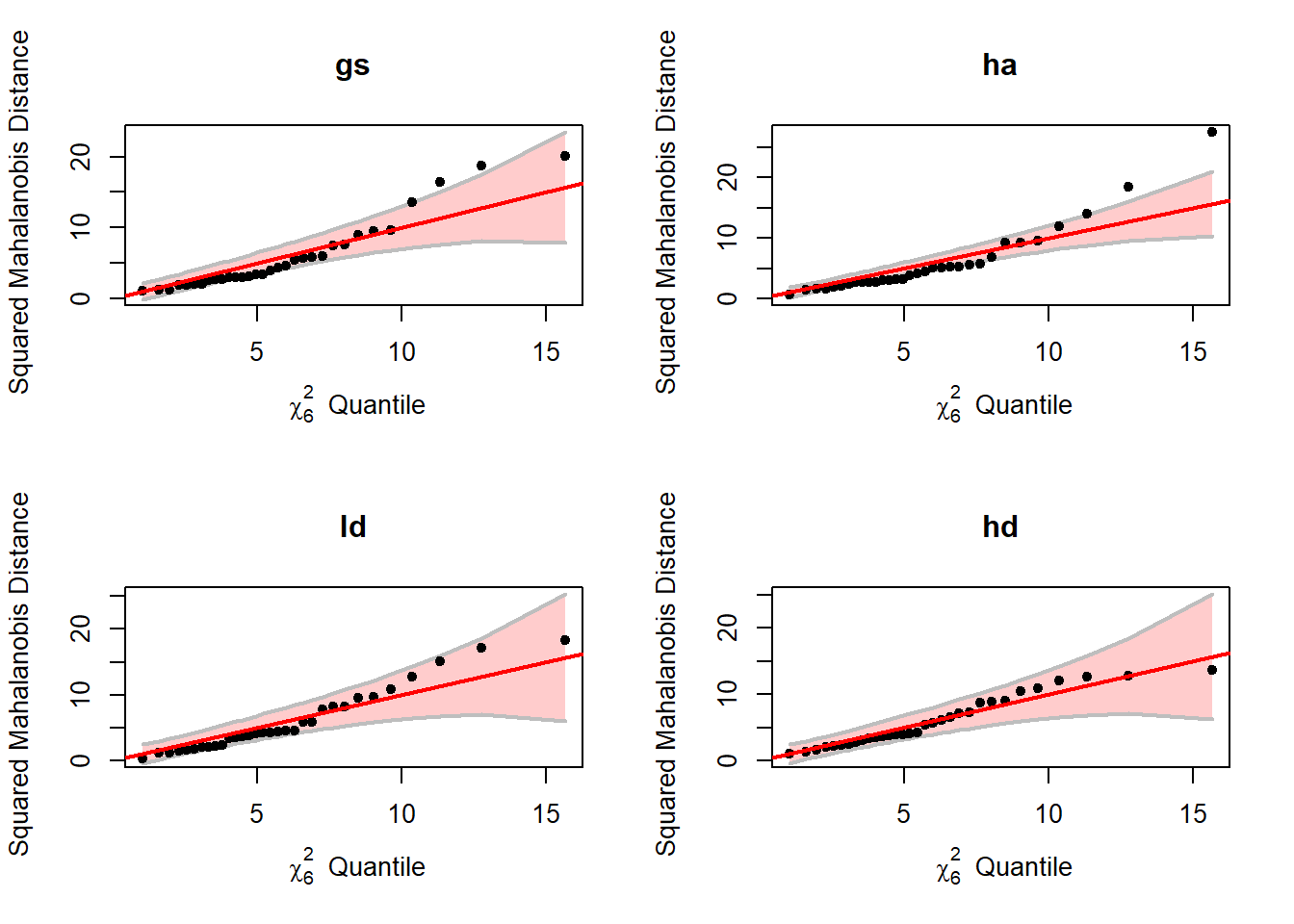 For MANOVA we are concerned with the within group multivariate normality, the assumption does not appear to be met here either (Figure 4.9). The code output below indicates the rows with the greatest deviation from normal.