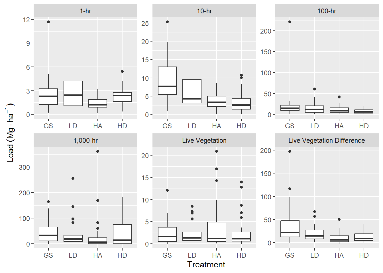 Figure 4.1: Boxplots of fuels data summarized for six fuel classes across four overstory harvest treatments, prior to pre-commercial thinning, 10 years after harvest. Woody and herbaceous vegetation have been combined and sound and rotten, 1,000-hr fuels have been combined.