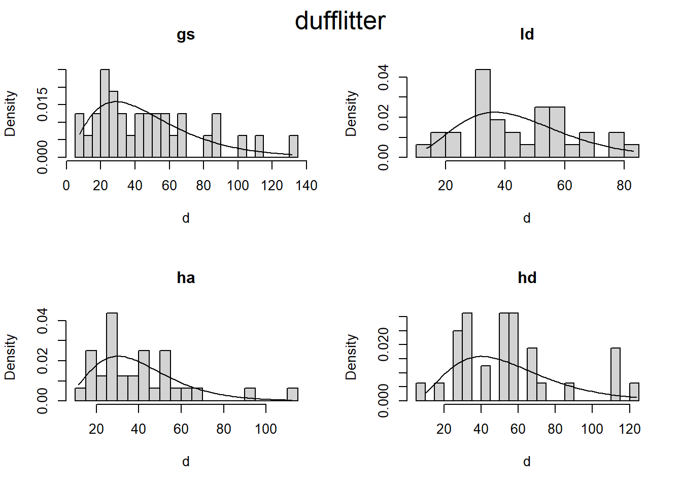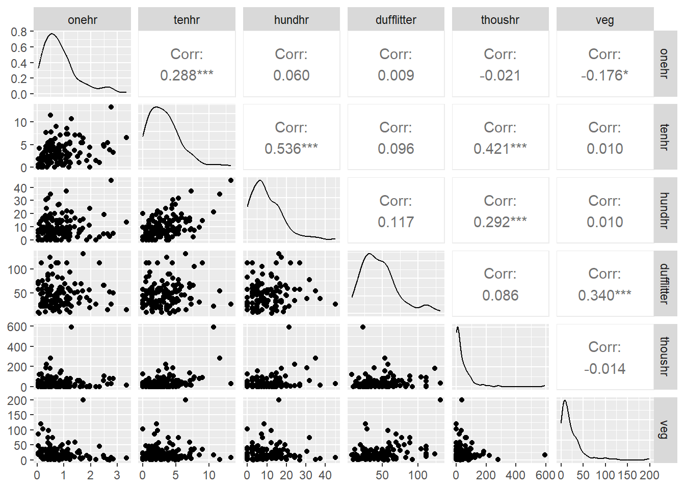 We have a range of response variables that include loading in several different classes of surface fuels. Some of these may be correlated with each other, which may have an effect on our interpretation of differences between treatments. For instance, if duff-litter load is negatively correlated with vegetation, even if we don’t see differences between treatment in either of these variables separately, it might be found that for any given level of vegetation loading, one treatment, or another may have consistently higher levels of duff-litter. I will be analyzing fuel loading categories independently. While not ideal, this simplifies the analysis.