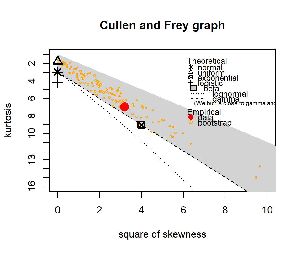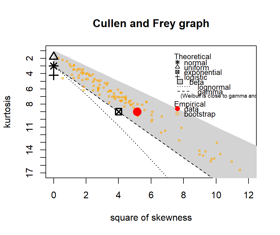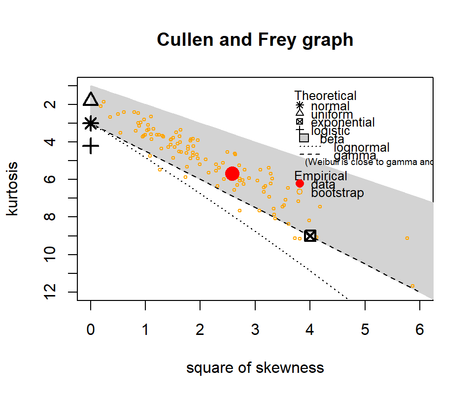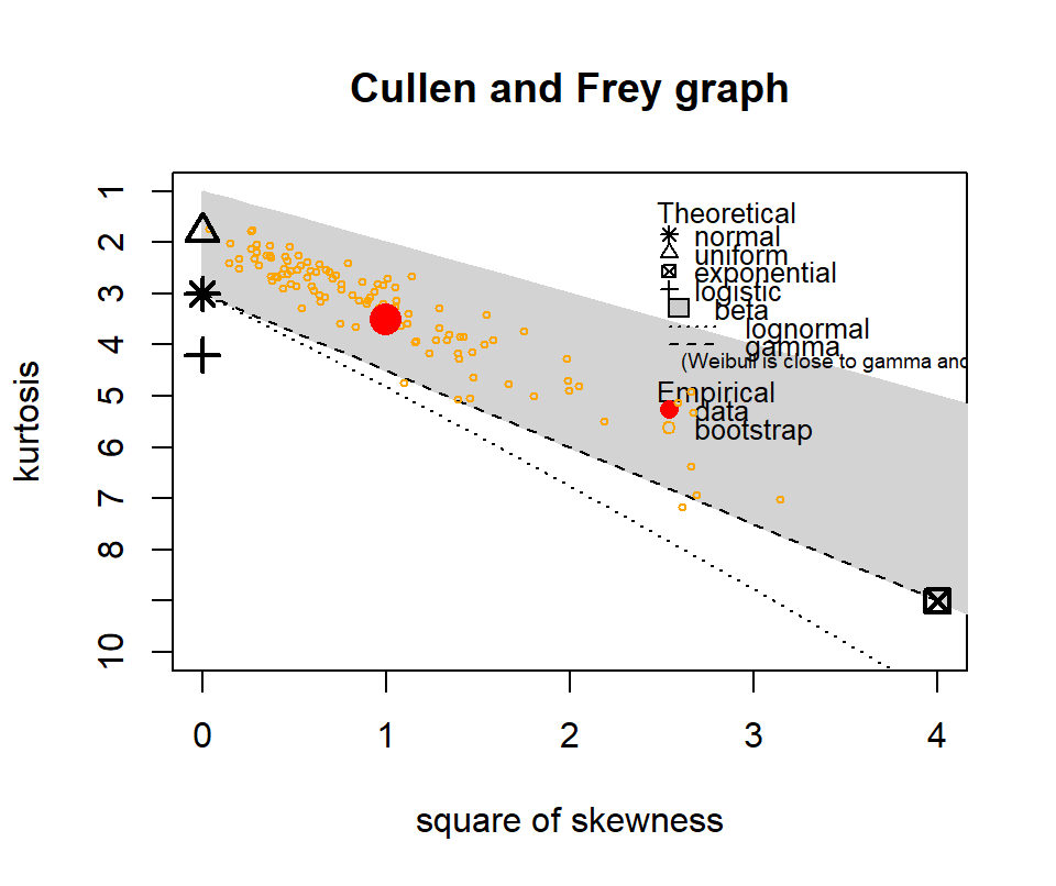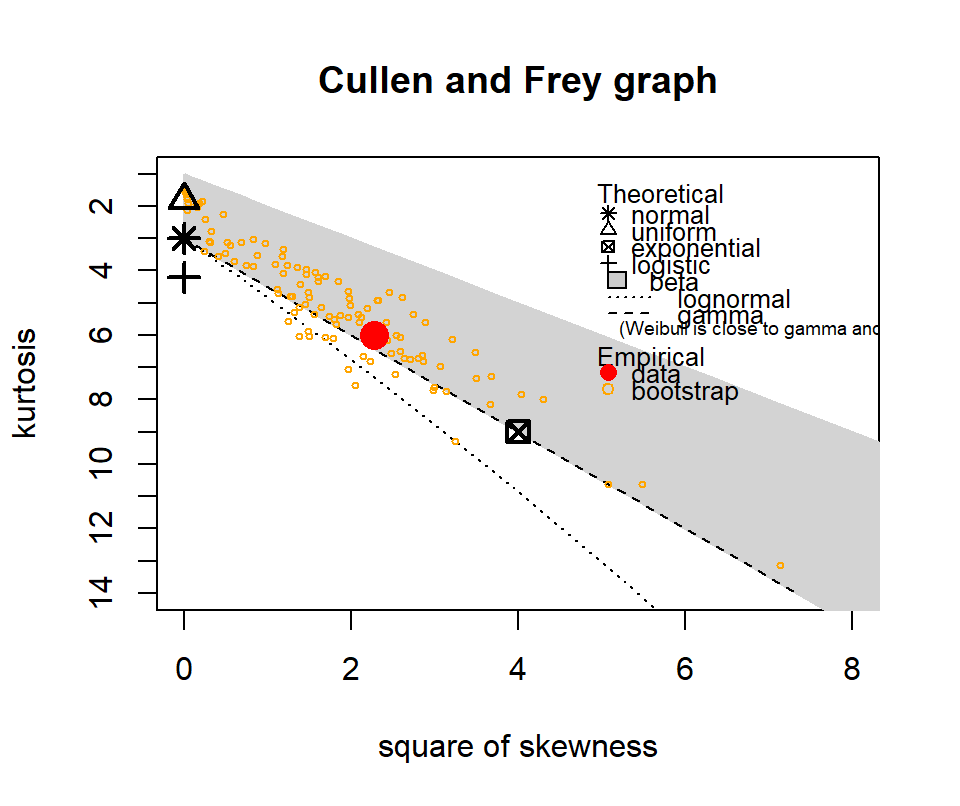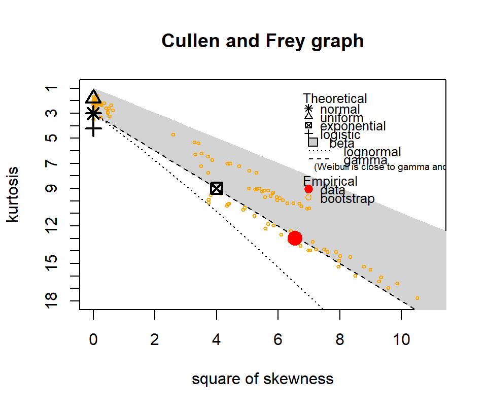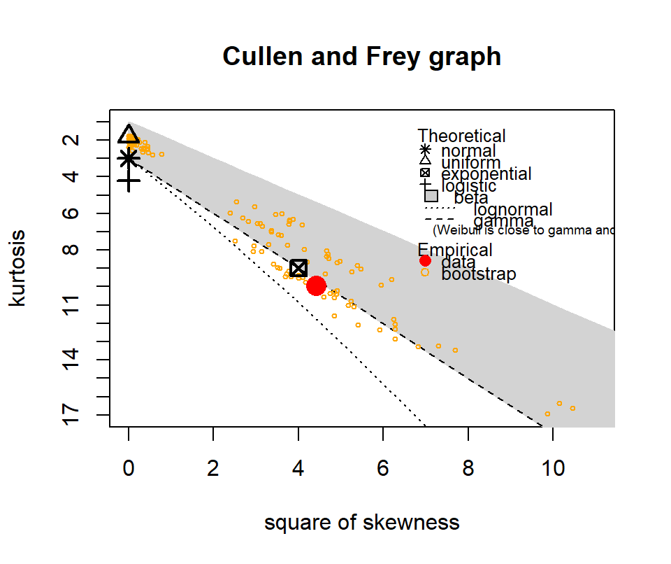 The following show where our data lies in terms of kurtosis and skewness compared to other common distributions. It looks somewhat Gamma-ish?
