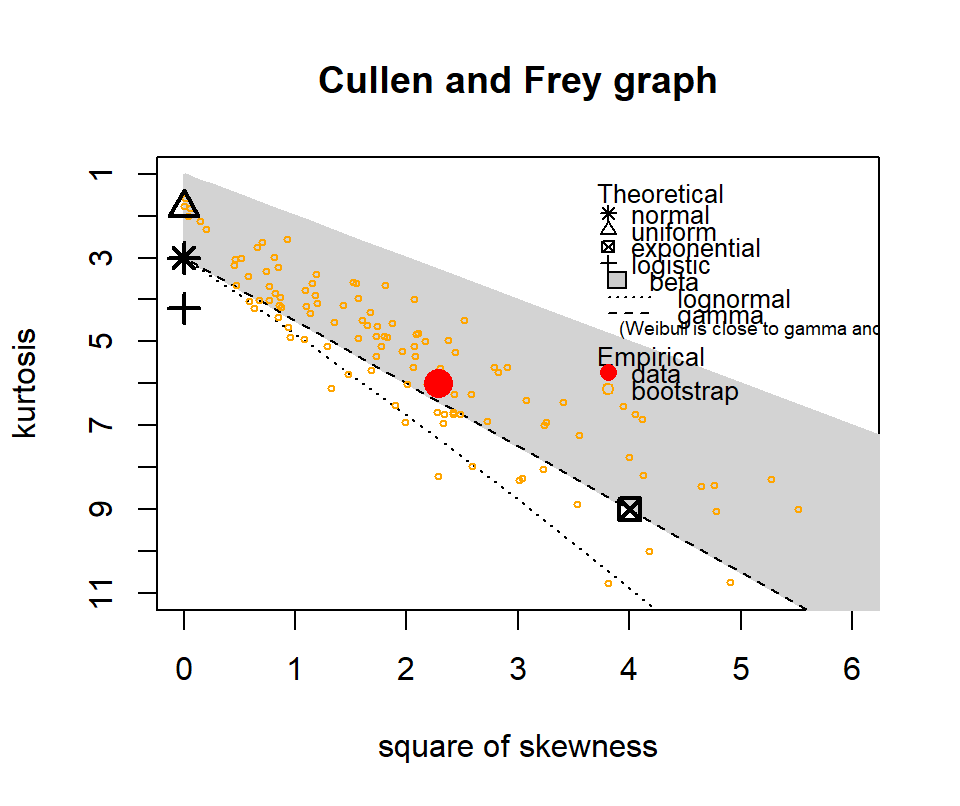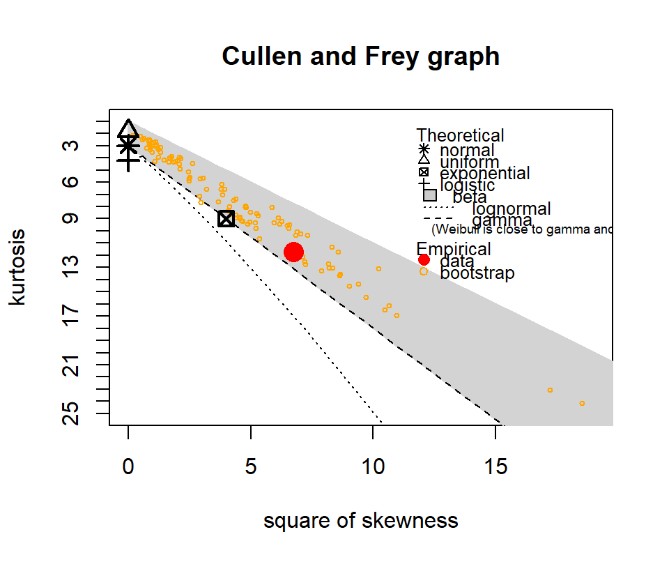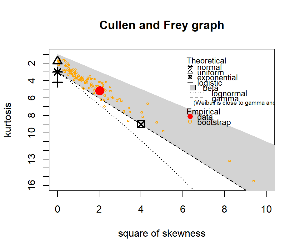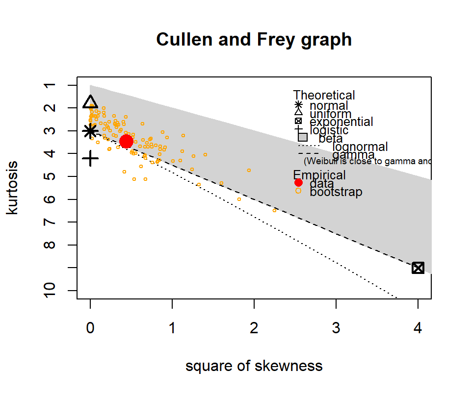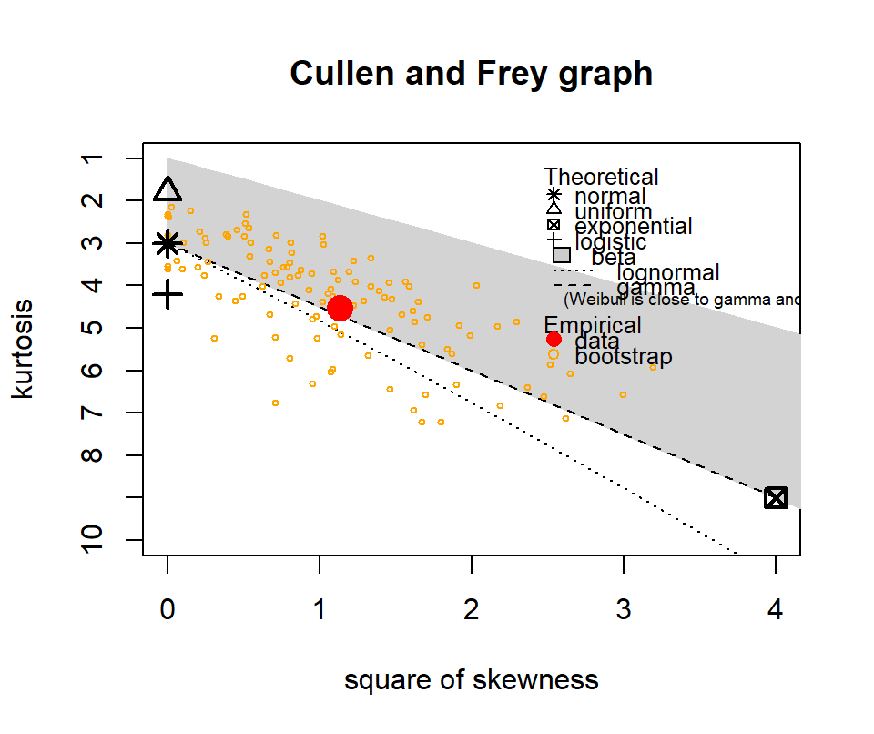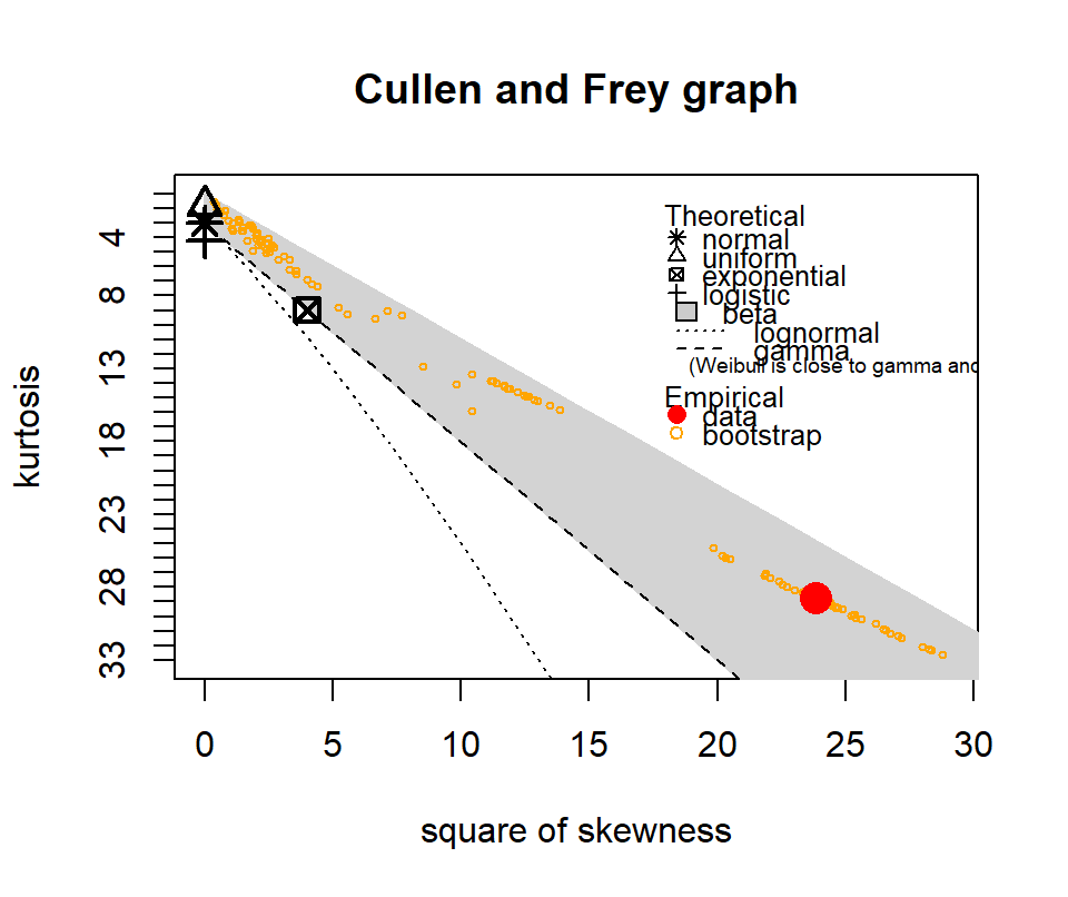 The following show where our data lies in terms of kurtosis and skewness compared to other common distributions. It looks somewhat Gamma-ish?