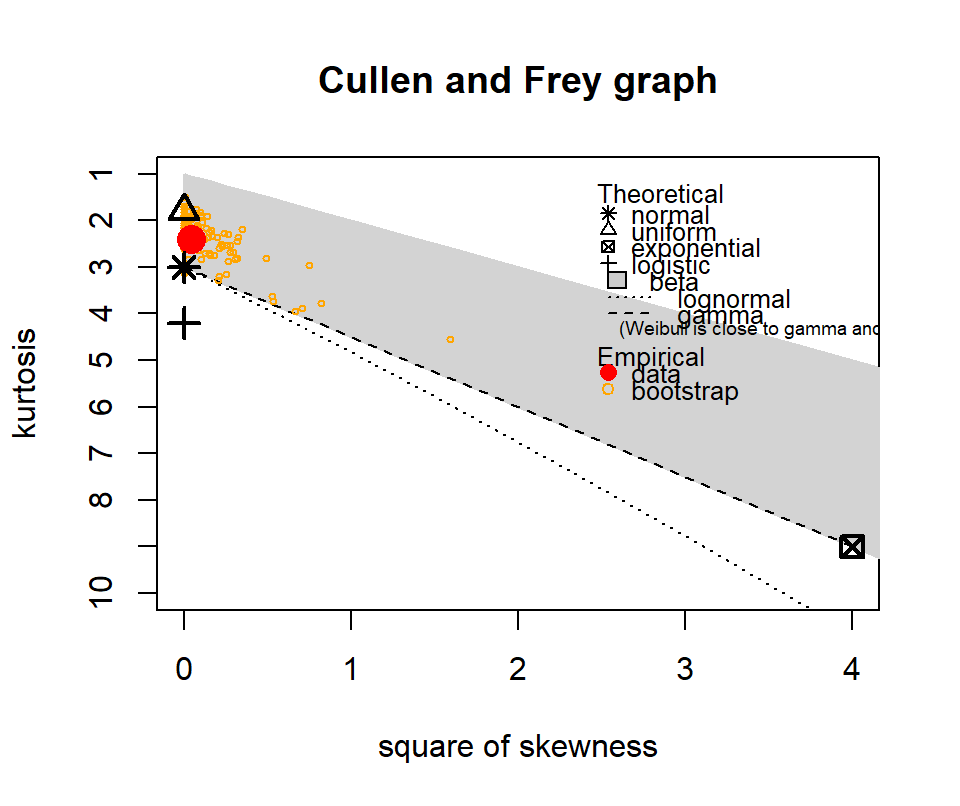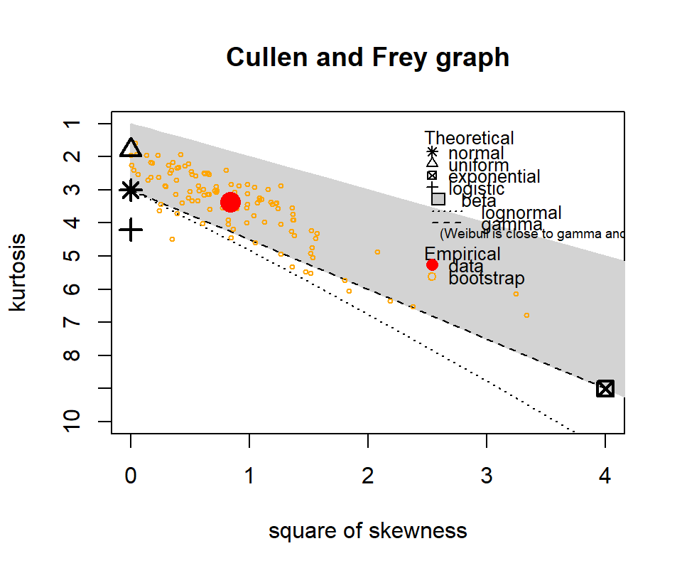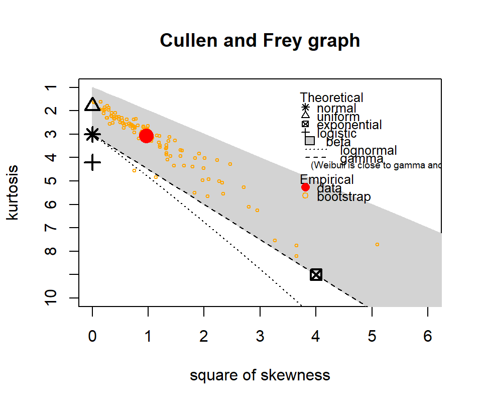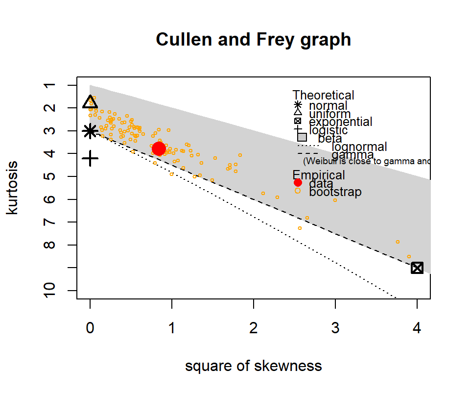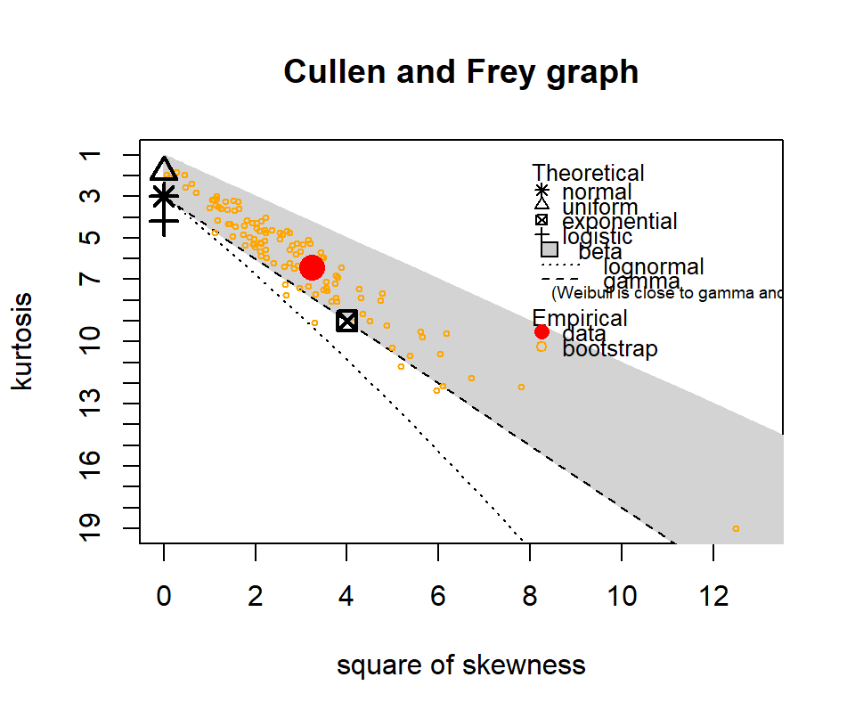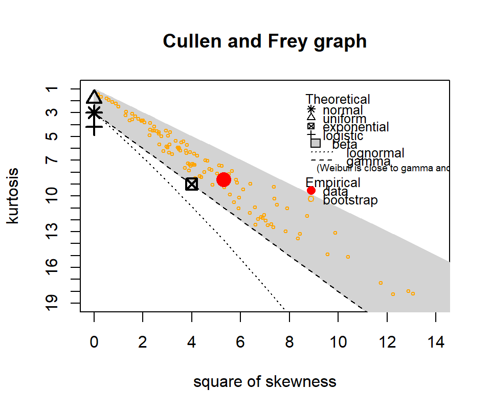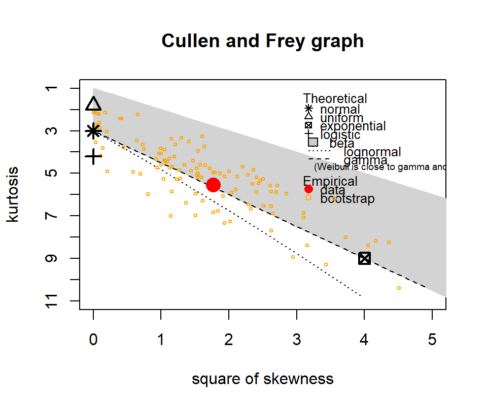 The following show where our data lies in terms of kurtosis and skewness compared to other common distributions. It looks somewhat Gamma-ish?