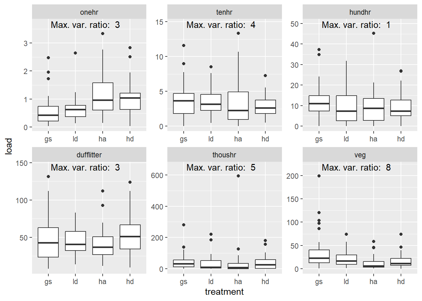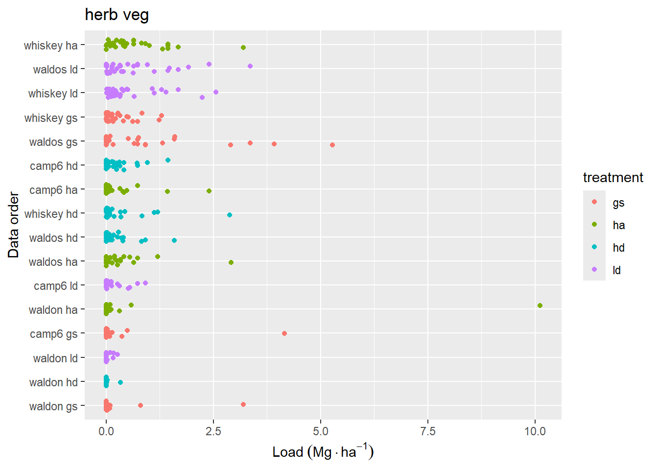 For further testing, I will summarize the data somewhat, by combining vegetation loading (woody and herb), and coarse woody loading (sound and rotten) into just two loading metrics. Now we have the following response variables: