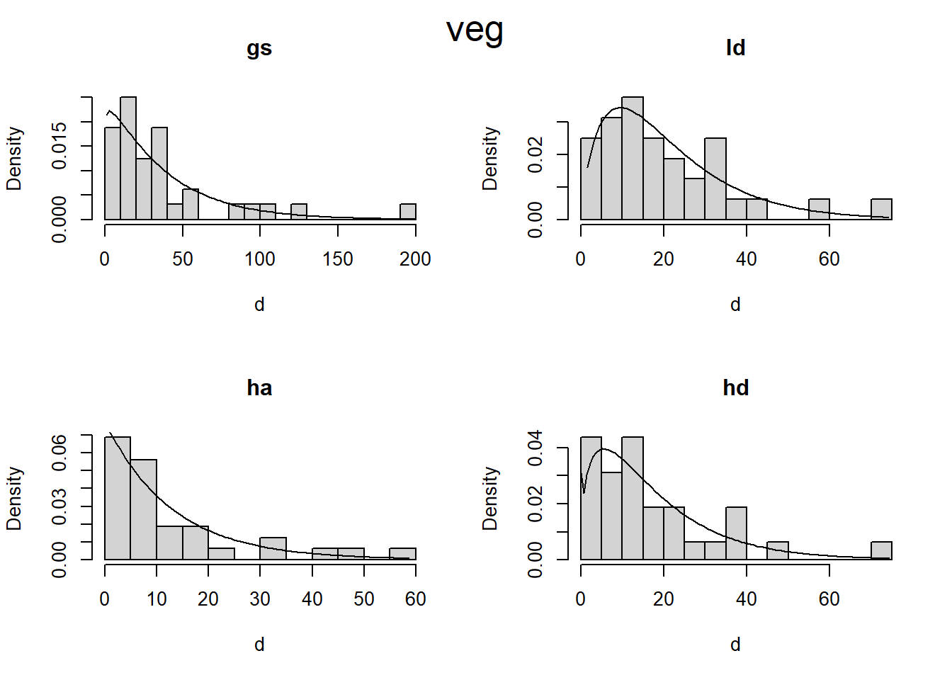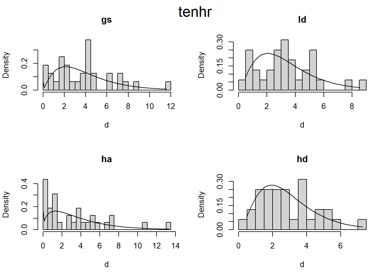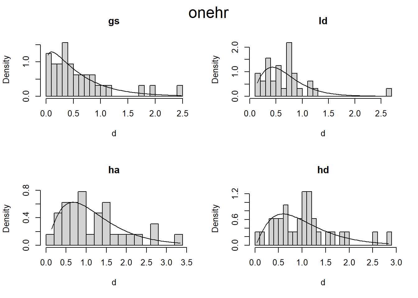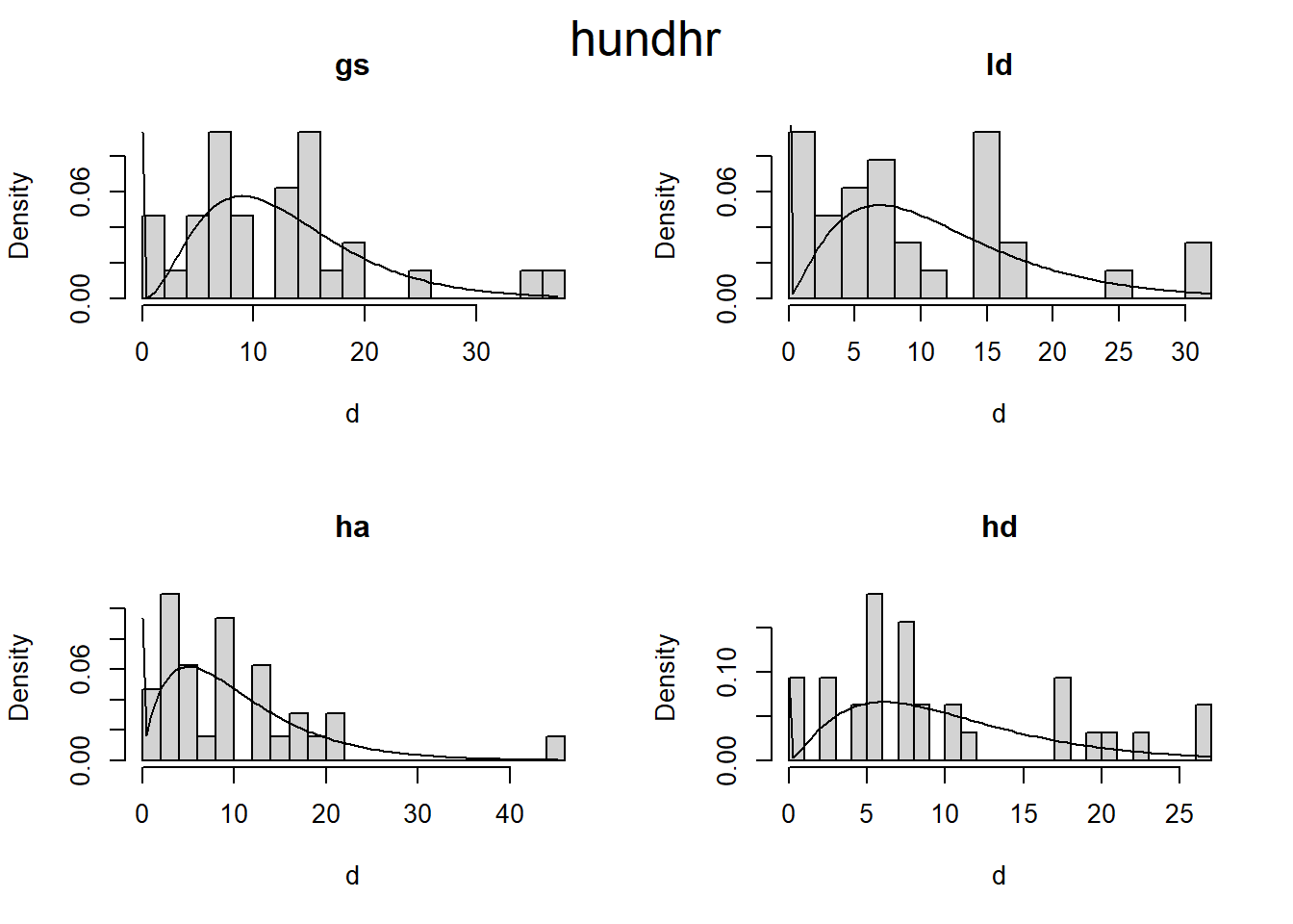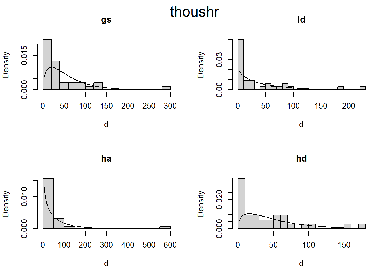 # Zero adjusted Gamma distribution fit to histogramsplot_zaga <-function(i, d) { m1 <- gamlss::gamlssML(d, family = gamlss.dist::ZAGA())hist(d, prob =TRUE, main = i, breaks =20)curve( gamlss.dist::dZAGA(x, mu = m1$mu, sigma = m1$sigma, nu = m1$nu), # nolintfrom =min(d),to =max(d),add =TRUE )}plot_zaga_class <-function(data, class_name) {if (missing(class_name)) { class_name <-as.character(substitute(data)) class_name <- class_name[length(class_name)] }par(mfrow =c(2, 2))iwalk(data, ~plot_zaga(.y, .x))mtext(class_name, cex =1.6, side =3, line =-2, outer =TRUE)}d2 <- d |>map(~map(.x, "load"))iwalk(d2, ~plot_zaga_class(.x, .y))