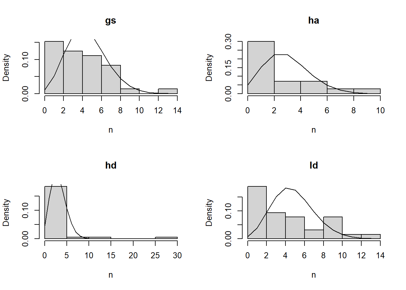 When using manova to test for difference between groups with multiple response variables, it is important that the response variables are multivariate normally distributed. Unfortunately, it would appear that we have a probelem with normality. The raw data for each loading variable is clearly not normally distributed Figure 4.7.