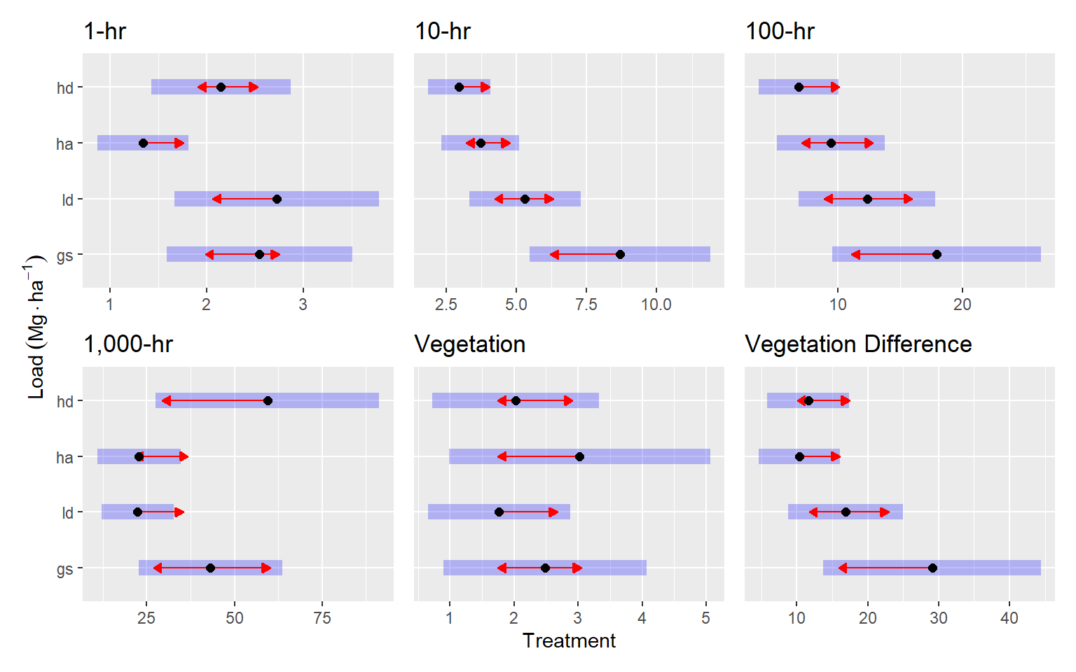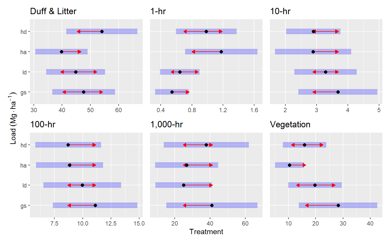 For Duff & Litter, the largest difference was between the HD and HA treatments. The HD treatment had about 1.4 times more duff and litter (p = 0.07). Generally, all treatments were similar, with estimated loading of around 50 Mg ha-1. One-hour fuels were around 50% higher in the HA treatment compared to the LD and GS treatments (p = 0.07, and p = 0.01, respectively), with mean differences of around 0.5 Mg ha-1. Ten, hundred and thousand-hour fuels were statistically, very similar across treatments (p = 0.7 — p = 1). Point esimates varied by about 1, 3, and <20 Mg ha-1 for ten, hundred, and thousand-hour fuels, respectively.