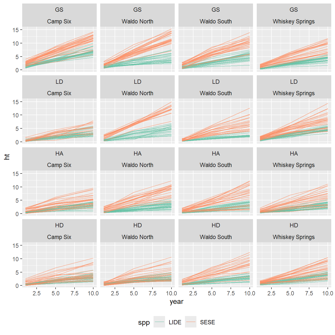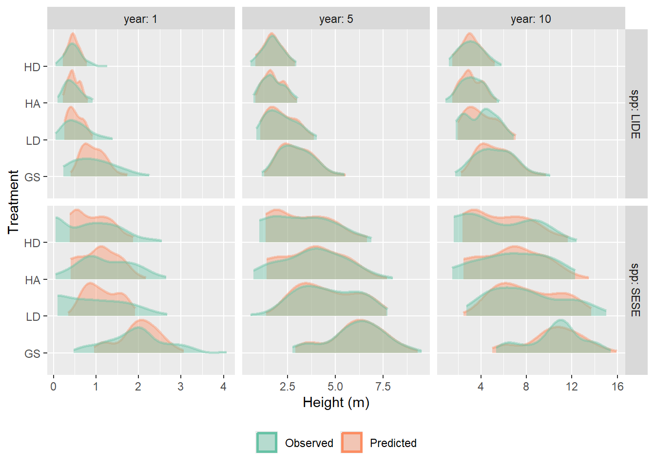 Because the best model did not contain a species x treatment interaction, comparisons between treatments is the same for both species. The GS treatment resulted in greater heights in year 10 than the other treatments (0.001 < p < 0.04). Predicted mean height for redwood ranged from 10.29 m in the GS treatment to 6.16 m in the HD treatment. For tanoak, predicted mean height ranged from 5.12 in the GS treatment to 3.04 in the HD treatment. Predicted mean heights followed the pattern GS > LD > HA > HD.