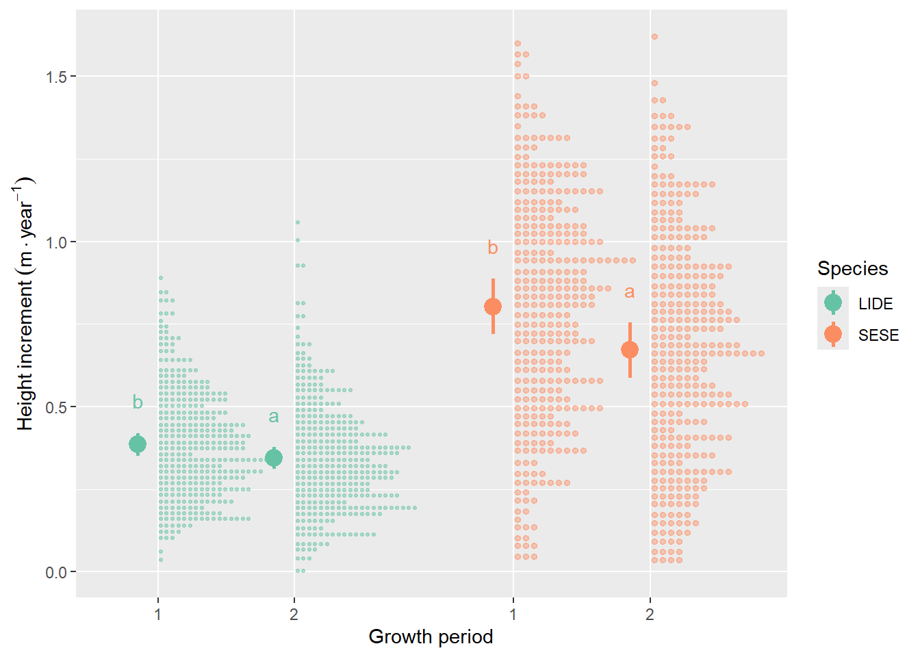 Figure 9.4: There was a significant difference in height increment between period 1 and 2 for both species.