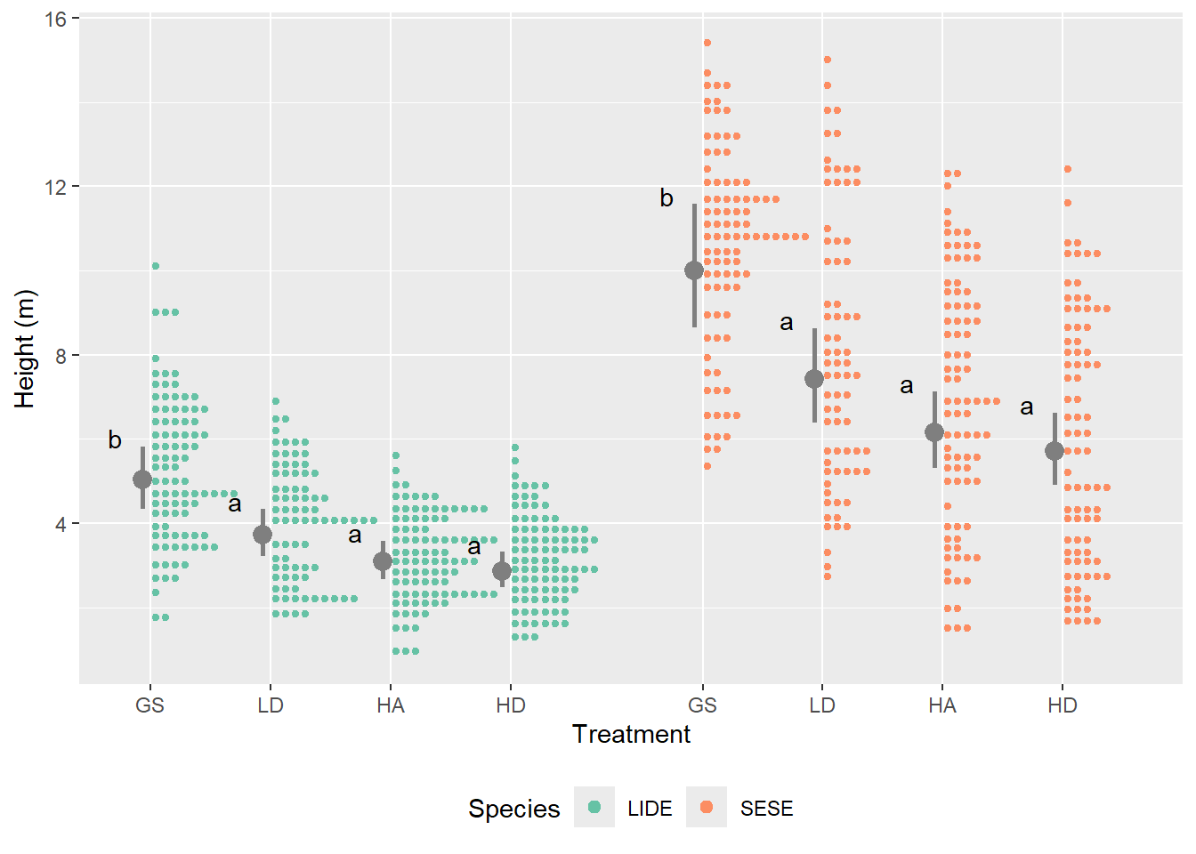Figure 9.8: Marginal means at year 10 based on height data collected three times over 10 years. The same letter within a species indicates that there was not enough evidence to differentiate those treatments.