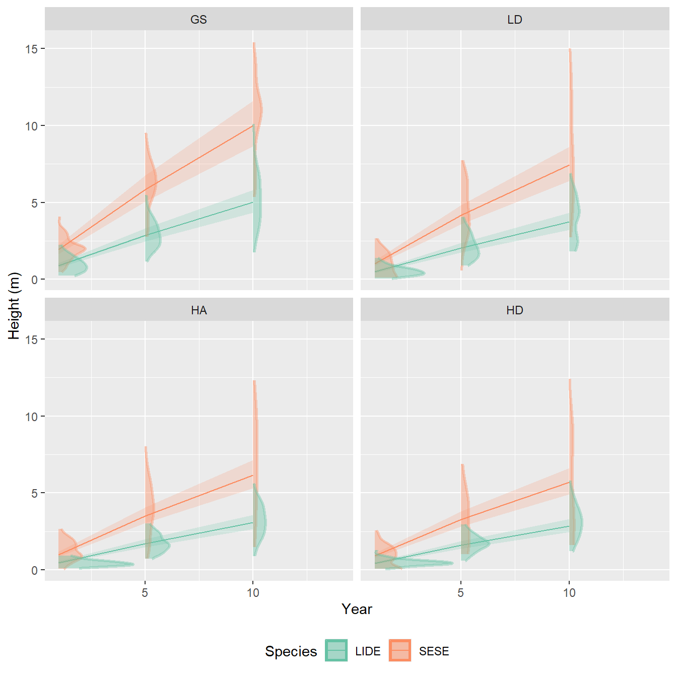 Figure 9.7: Average species and treatment specific height as a linear function of year. Density distributions represent the raw data associated with the estimate at that point. The grey line is the OLS fit for reference.