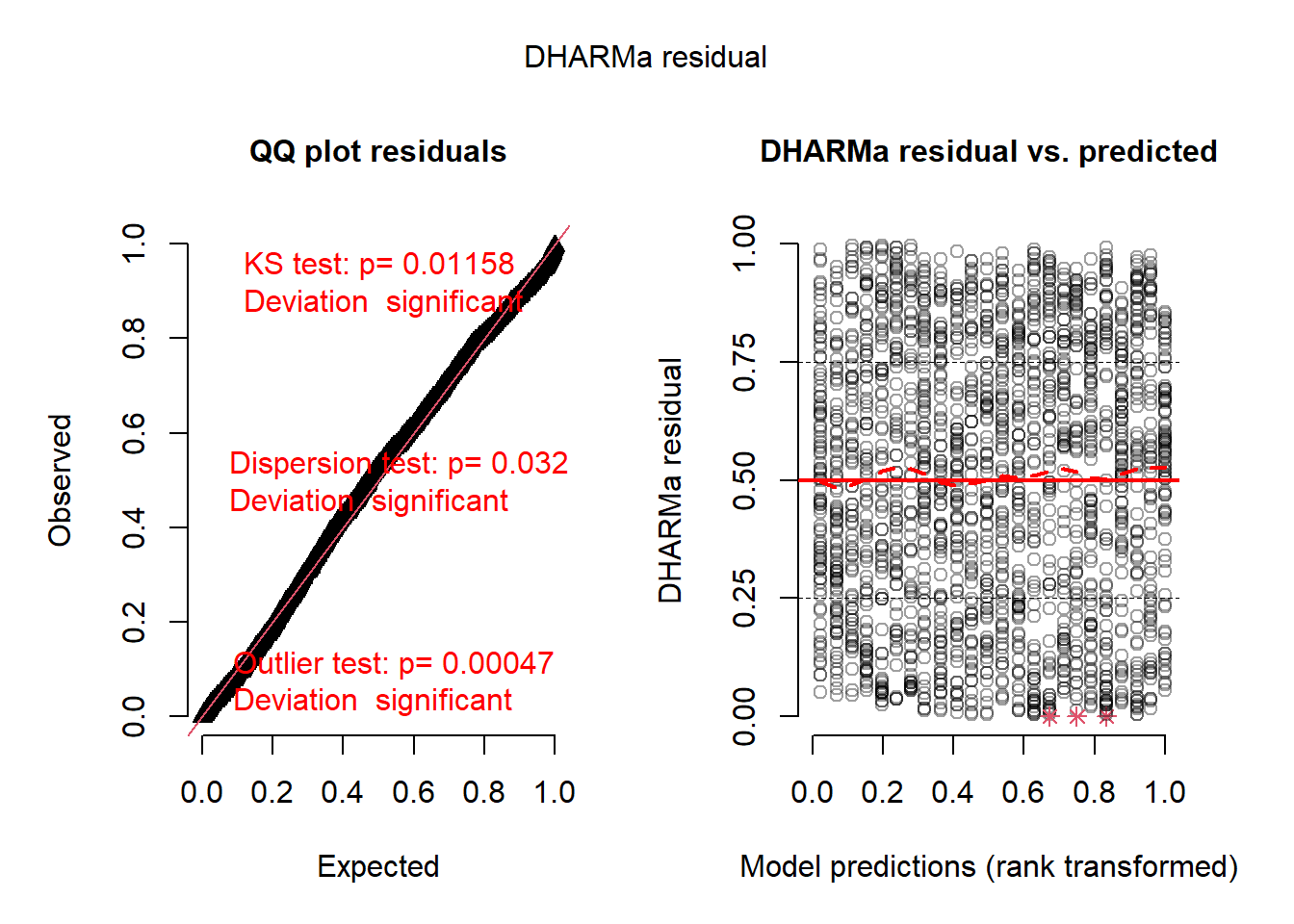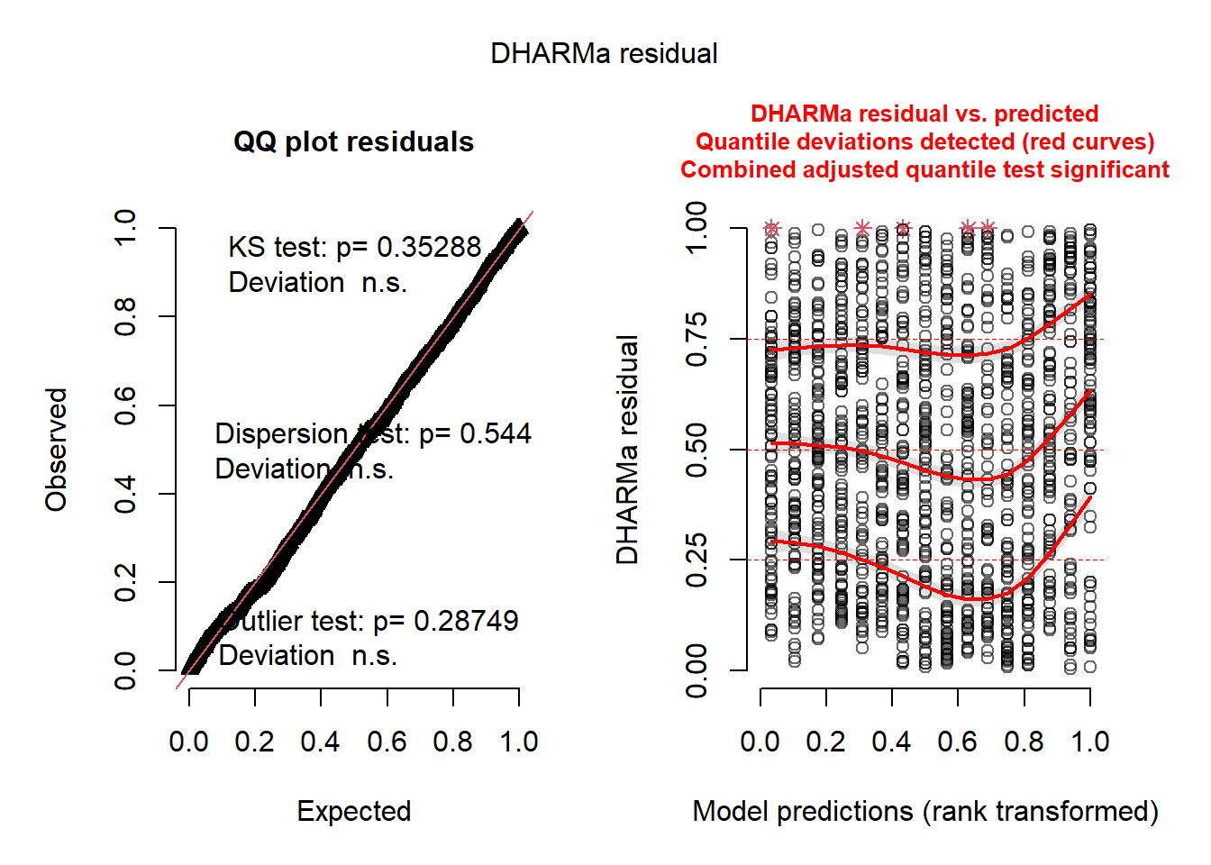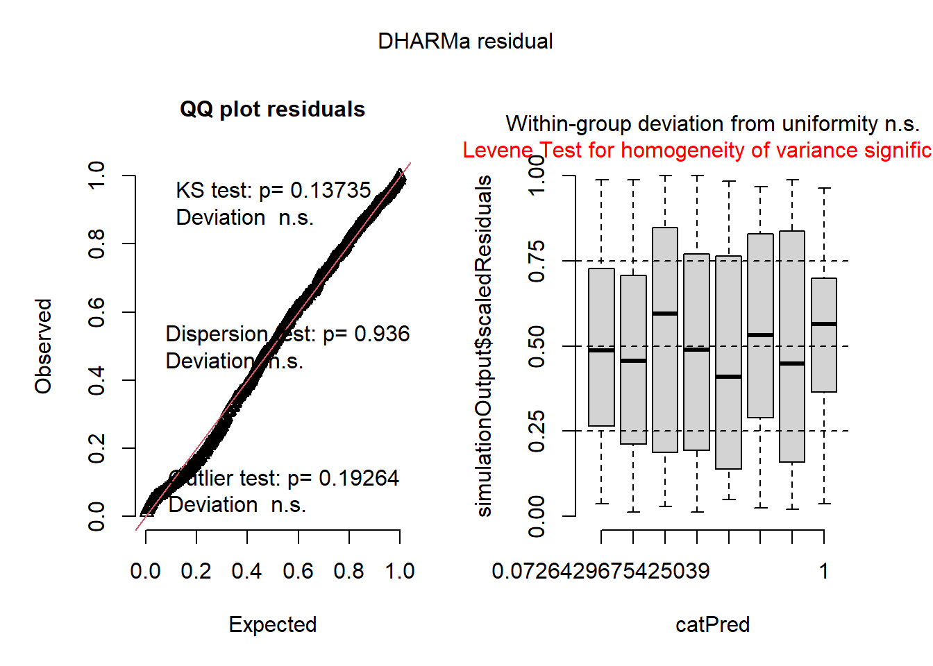 The simplest model that I’m willing to look at includes a treatment/species interaction, and no random effects. It will serve as a baseline for comparison.