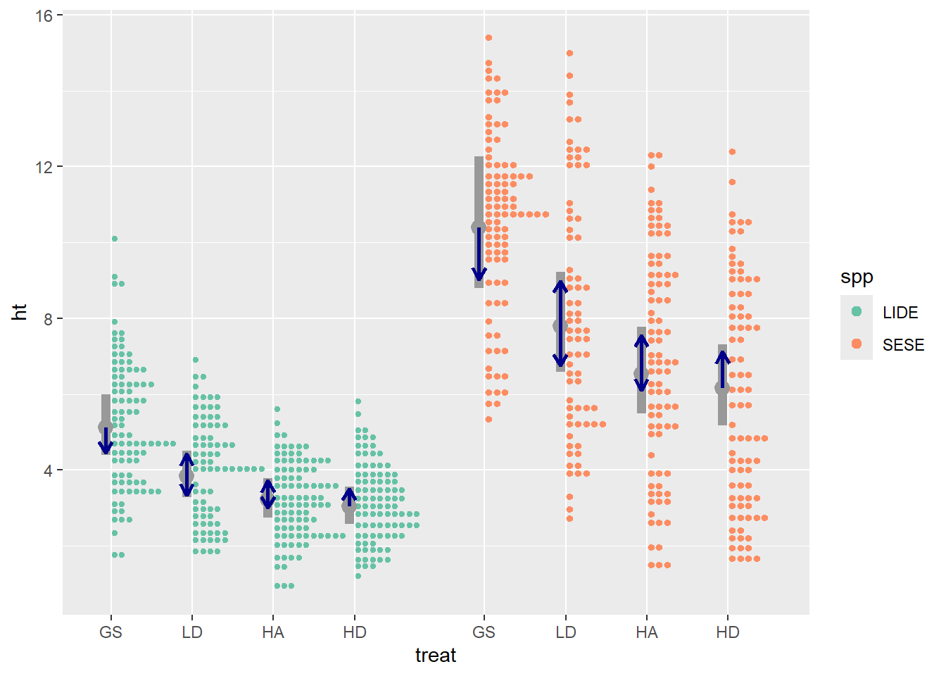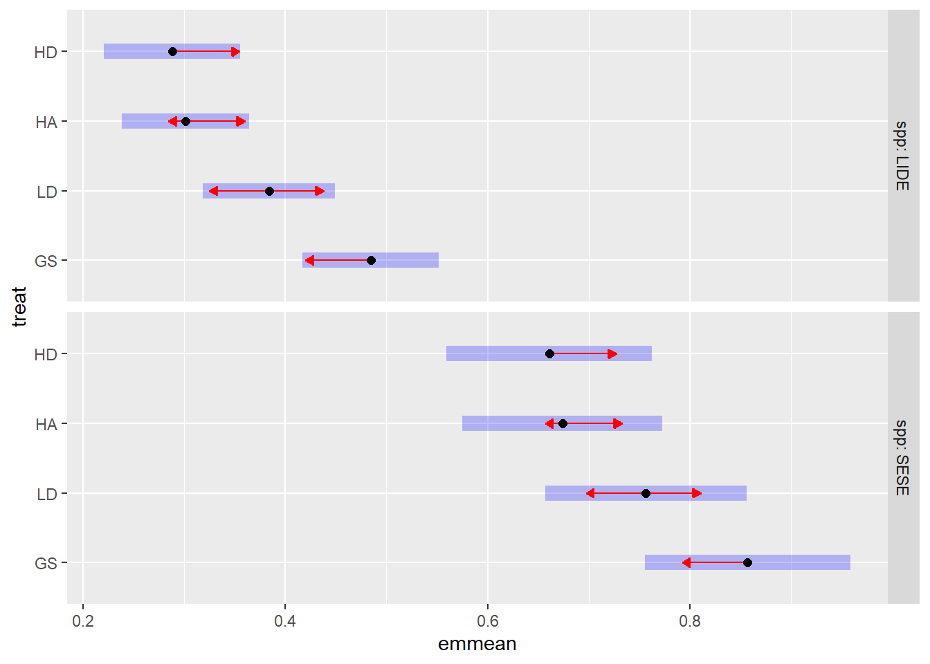 emm_treat <-emmeans(minc_sel, "treat", by ="spp")plot(emm_treat, comparisons =TRUE)