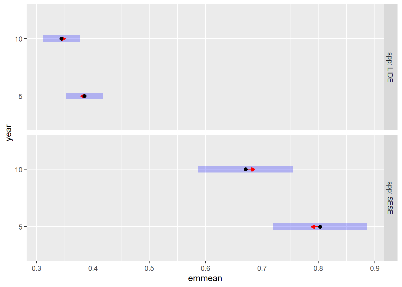 emmeans(minc_sel, c("year"), by ="spp") |>plot(comparisons =TRUE)