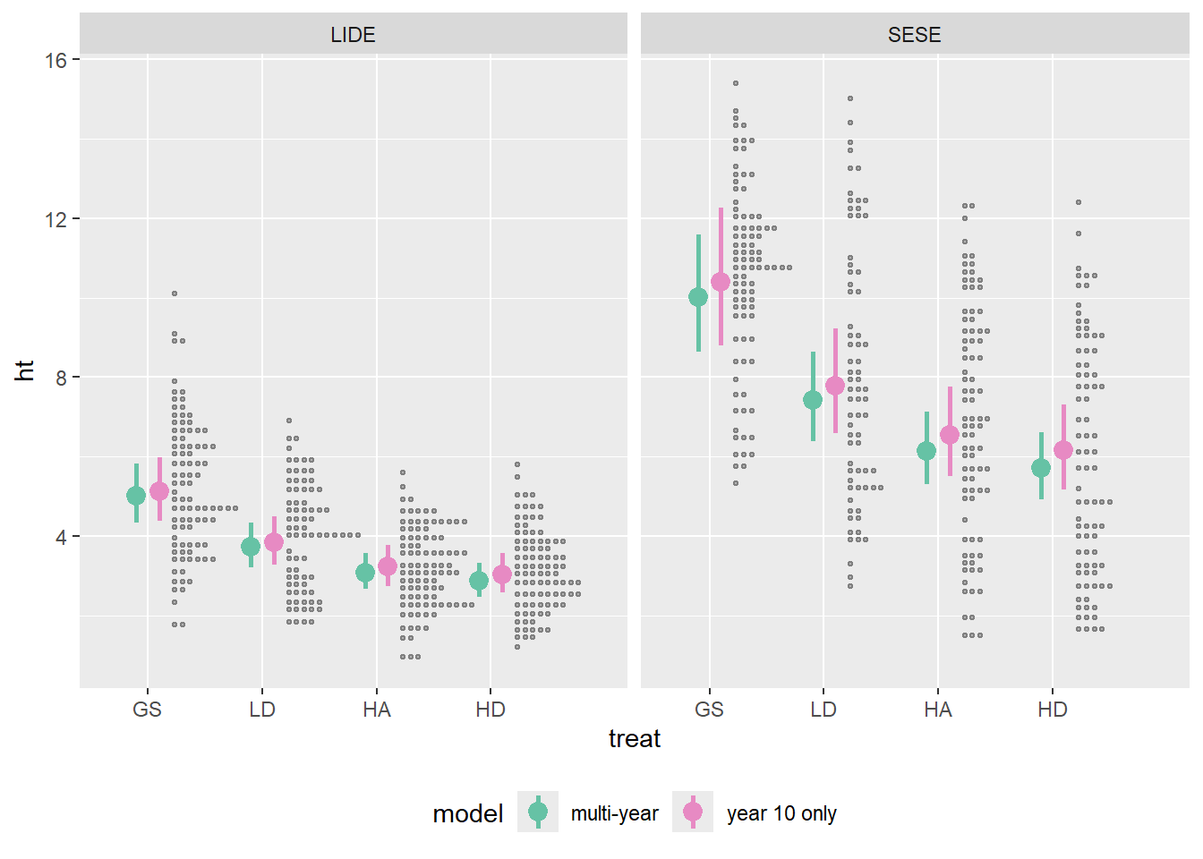 # I'm calling the height data "d"dht10 <- sprouts |>lengthen_data("ht") |>filter(year ==10)mht101 <-lm(ht ~ treat * spp, data = dht10)mht102 <-lmer(ht ~ treat * spp + (1| plot) + (1| site), data = dht10)