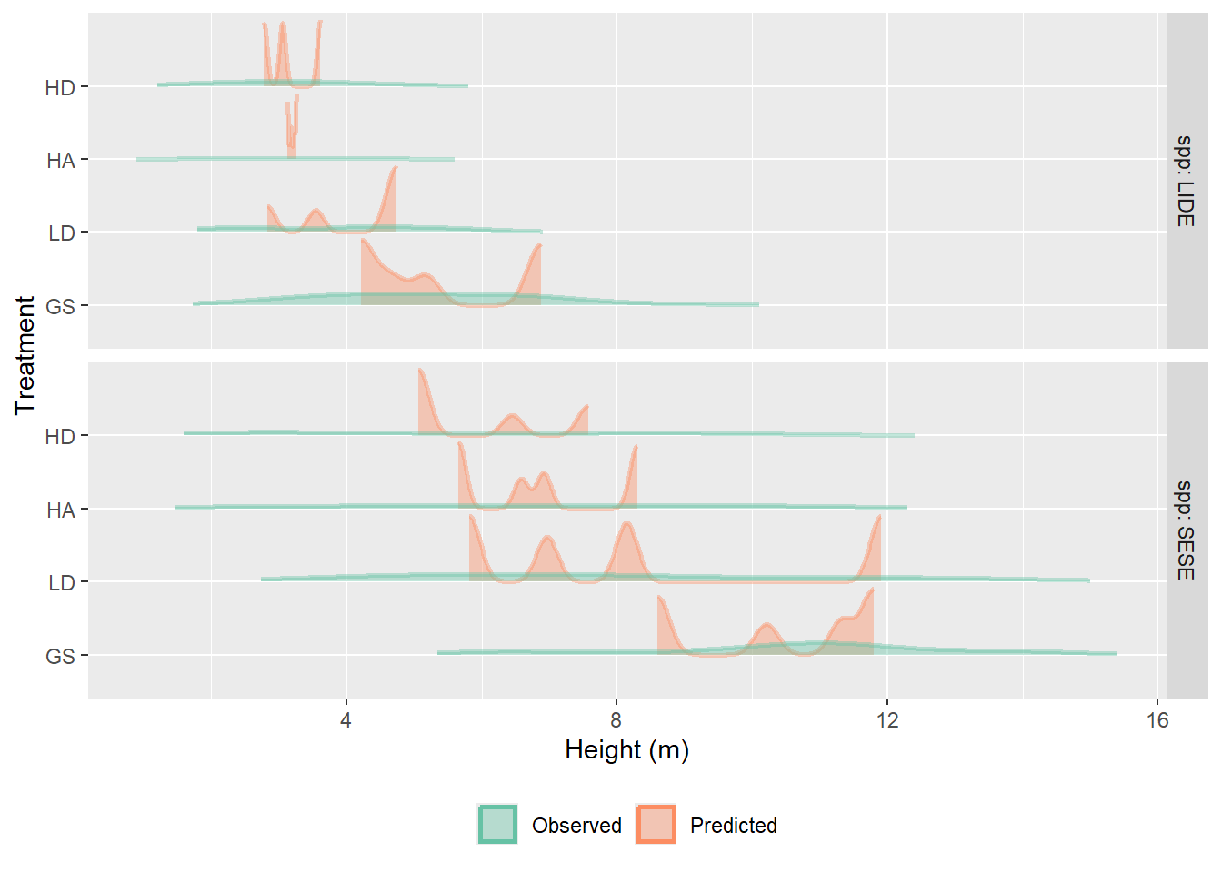#| label: fig-height-pred-fit-10-only#| fig-cap: >#| Oberved and predicted height distribution of our observed dataset using the#| selected year-10-only model.#| Predictions were made using all random effects.sprouts |>lengthen_data("ht") |>filter(year =="10") |>mutate(Predicted =predict( ht10_sel,lst(site, plot, tree, treat, spp, year),type ="response" ),Observed = ht ) |>pivot_longer(c(Observed, Predicted)) |>ggplot(aes(value, treat, color = name, fill = name)) +stat_slab(alpha =0.4, normalize ="xy") +facet_grid(vars(spp), scales ="free", labeller = label_both) +labs(x ="Height (m)", y ="Treatment") +scale_color_brewer(palette ="Set2", aesthetics =c("color", "fill")) +theme(legend.position ="bottom", legend.title =element_blank())